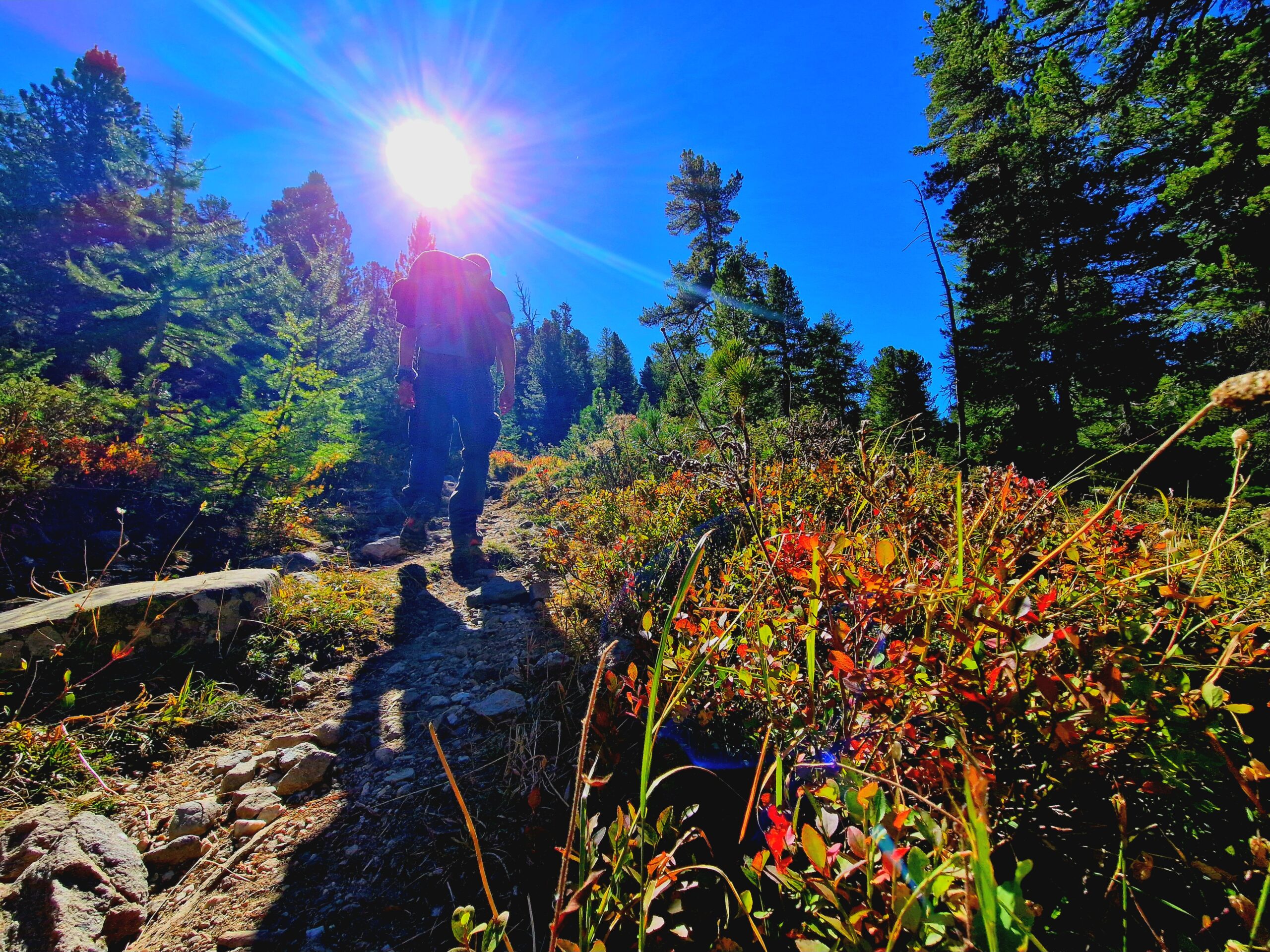 Arrivé sur le parking de Plan Peyron, une seule chose à faire : aller à contre-courant de la plupart des gens, à l’opposé du lac. Sur le chemin forestier, un discret sentier invite à prendre de la hauteur à travers bois. Racines sinueuses, troncs tarabiscotés presque fantasmagoriques, mélèzes majestueux et autres pins cembro, l’une des stars de la balade. La lumière insolente de l’été a laissé sa place à une ambiance plus douce où l’heure dorée sonne à chaque instant.