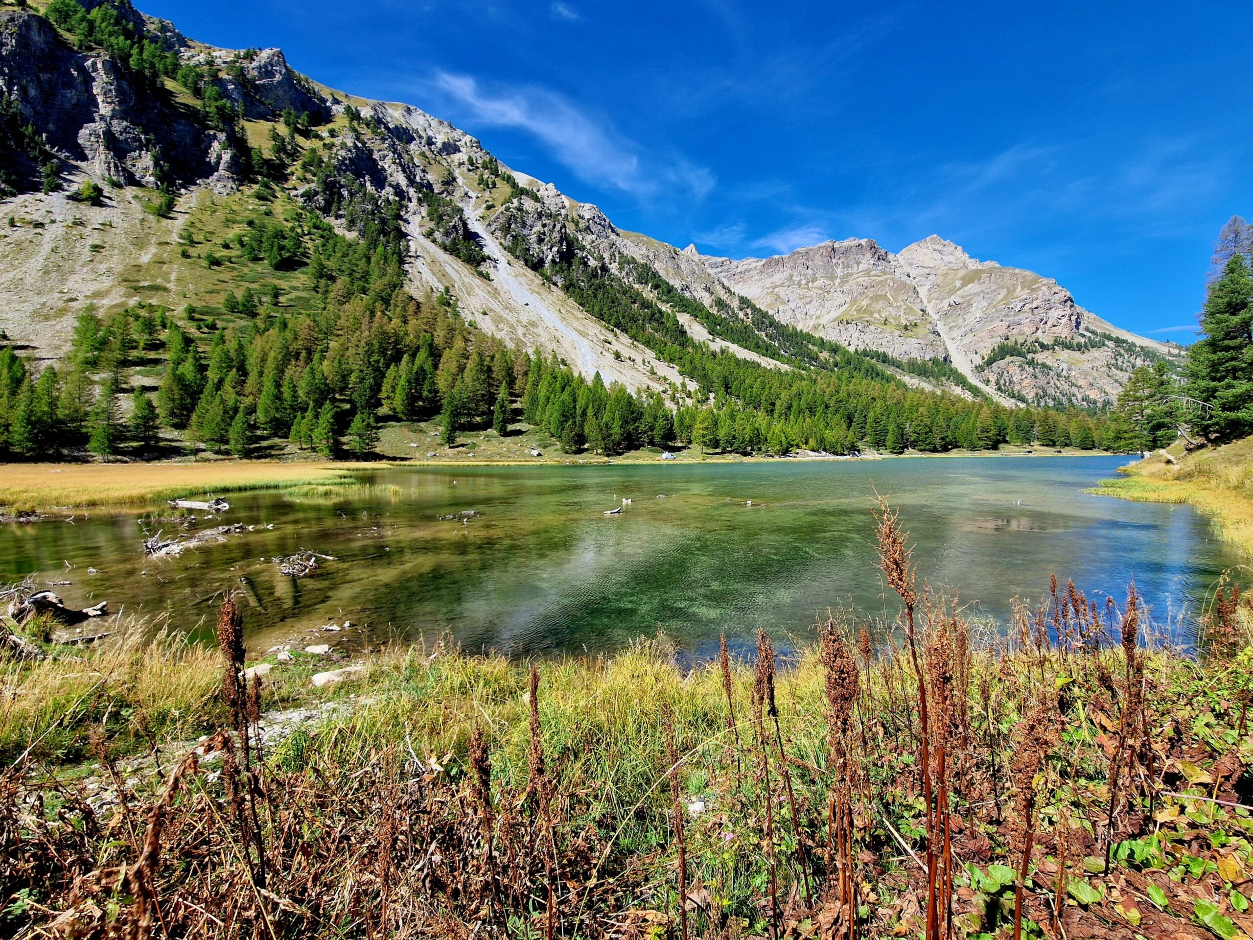 Pas question de prendre la route forestière. Rejoindre l’autre rive, celle qui reste à l’ombre des mélèzes en pleine métamorphose automnale. Et le sentiment de ne pas rejoindre tout de suite la civilisation. Même si par beau temps l’Orceyrette reste prisé des visiteurs à la journée, posés les pieds dans l’eau comme en donne envie l’été indien. Suivre le torrent éponyme, encore un peu, et plonger de nouveau dans la forêt plus clairsemée. Retour à Plan Peyron, les yeux pleins de mille couleurs, rouge, feu, or.