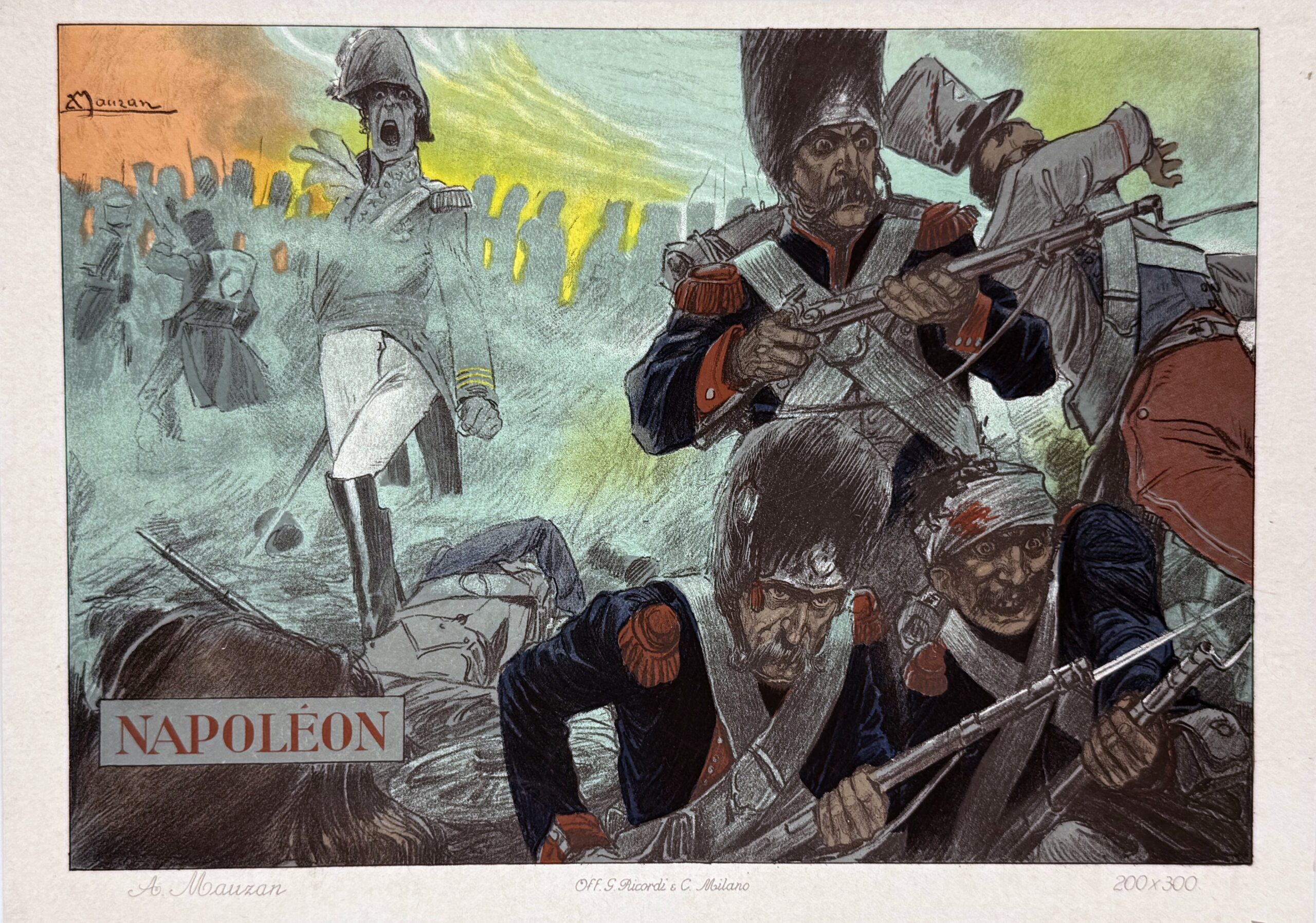 Mauzan commence à produire des affiches pour le cinéma muet italien en 1908. Il réalise une affiche en quatre panneaux pour le film italien Napoleone a Sant’ Elena dirigé par Mario Caserini en 1911, qui retrace les dernières années de Napoléon en exil. Cette scène très expressive représente la bataille de Waterloo opposant les troupes de Napoléon à l’armée anglaise en juin 1815. On y aperçoit à gauche le général Cambronne dont la légende raconte qu’il aurait déclaré aux Anglais, alors que tout semblait perdu : « La Garde meurt et ne se rend pas », ou pour avoir refusé la défaite par un autre mot, plus grossier. Il est aujourd’hui encore considéré comme l’un des plus grands fidèles de Napoléon.