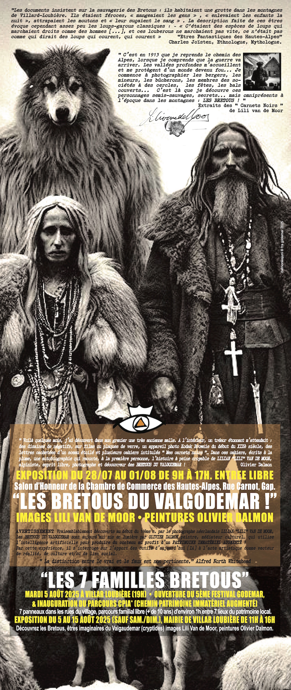 Exposition photos “Les 7 Familles Bretous”. “Les documents insistent sur la sauvagerie des Bretous : ils habitaient une grotte dans les montagnes de Villard-Loubière. Ils étaient féroces, ‘mangeaient les gens’ , ‘enlevaient les enfants la nuit’, attrapaient les moutons et ‘leur suçaient le sang’. La description faite de ces êtres évoque cependant assez peu les loups-garous classiques : ‘C’étaient des espèces de loups qui marchaient droits comme des hommes…, et ces Louberous ne marchaient pas vite, ce n’était pas comme qui dirait des loups qui courent, qui courent’, ‘Etres Fantastiques des Hautes-Alpes’. Charles Joïsten, Ethnologue, Mythologue.