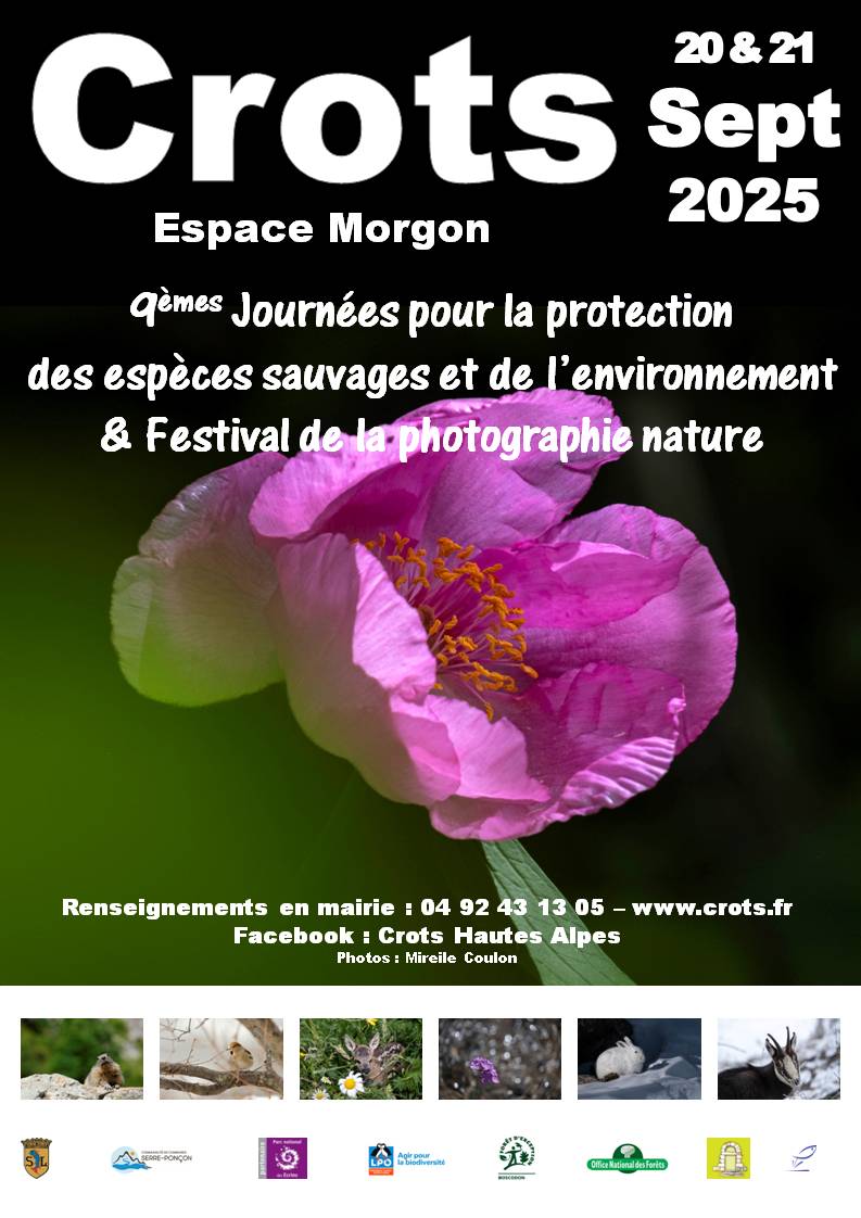 FESTIVAL DE LA PHOTOGRAPHIE NATURE Samedi 20 et dimanche 21 septembre 10h-18h – Espace Morgon – Entrée libre Photographes exposants : Christophe Bérlengue – Mathieu Falouni – Cyril Fonteynad Poitveneaux – Xavier Gallic – Olivier Garnier – Nicolas Jacquemart – Felix Michaud – Alain Raffour – Yann Serreau 9èmes JOURNÉES POUR LA PROTECTION DES ESPÈCES SAUVAGES ET DE L’ENVIRONNEMENT Samedi 20 septembre SORTIES TERRAIN (inscription obligatoire, nombre de places limité) 9h00 – Le nouveau marteloscope de Boscodon – Christophe Bernard – ONF* RDV sur le parking de l’Abbaye de Boscodon (prévoir chaussures de marche) 9h00 – Le vallon de Bragousse, un témoin de la formation des Alpes – Camille Vallon RDV sur le parking de l’Abbaye de Boscodon (prévoir chaussures de marche) CONFÉRENCES médiathèque de Crots 14h30 – L’eau dans tous ses états – Hervé Le Roy – AAPPMA* 16h00 – Pollution plastique : un combat humain – Jean-Paul Coulomb INAUGURATION DES 9èmes JOURNÉES salle multi-activités de l’Espace Morgon 18h00 – Présentation des photographes exposants – Mireille Coulon (retraitée du PNE*) et Jean Guillet 19h00 – Apéritif dînatoire PROJECTION salle multi-activités de l’Espace Morgon 20h00 – Projection du film Naïs au pays des loups – Rémi Masseglia Dimanche 21 septembre SORTIES TERRAIN (inscription obligatoire, nombre de places limité) 9h00 – Torrent du Boscodon : visite des ouvrages de correction du torrent et du dispositif de suivi des crues – François Ortar – Service RTM* de l’ONF* RDV parking de l’Abbaye de Boscodon 9h00 – La santé par la sylvothérapie (sylvothérapie) – Gabriel Marin – Ancien forestier de l’ONF* RDV parking de l’Abbaye de Boscodon CONFÉRENCES médiathèque de Crots 14h30 – État des connaissances sur les invertébrés du Parc national des Écrins – Damien Combrisson – PNE* 16h00 – Autour des palombes : 7 saisons d’observation d’un couple des Hautes Alpes – Yann Serreau AAPPMA : Association Agréée de Pêche et de Protection du Milieu Aquatique – ONF : Office National des Forêts – PNE : Parc National des Écrins – RTM : Restauration des Terrains de Montagne Renseignements et inscriptions : 04 92 43 13 05 (Emmanuelle) – e.cuenant@crots.fr