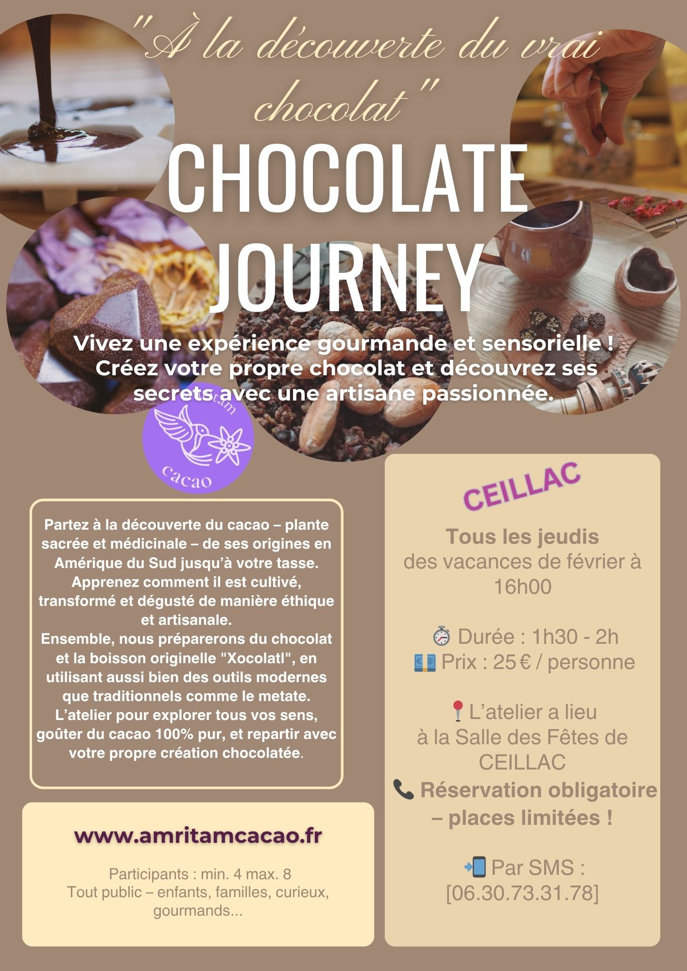 Ensemble, nous préparerons du chocolat et la boisson originelle “Xocolatl”, en utilisant aussi bien des outils modernes que traditionnels comme le metate : un outil en pierre traditionnel mésoaméricain utilisé avec une pierre tenue à la main pour moudre le Cacao/le maïs et les graines en farine. Un atelier pour explorer tous nos sens, goûter du cacao 100% pur, et repartir avec sa propre création chocolatée: tu fabriqueras un chocolat bean to bar, concept des plus fines chocolateries, et chocolat le plus naturel qui soit.