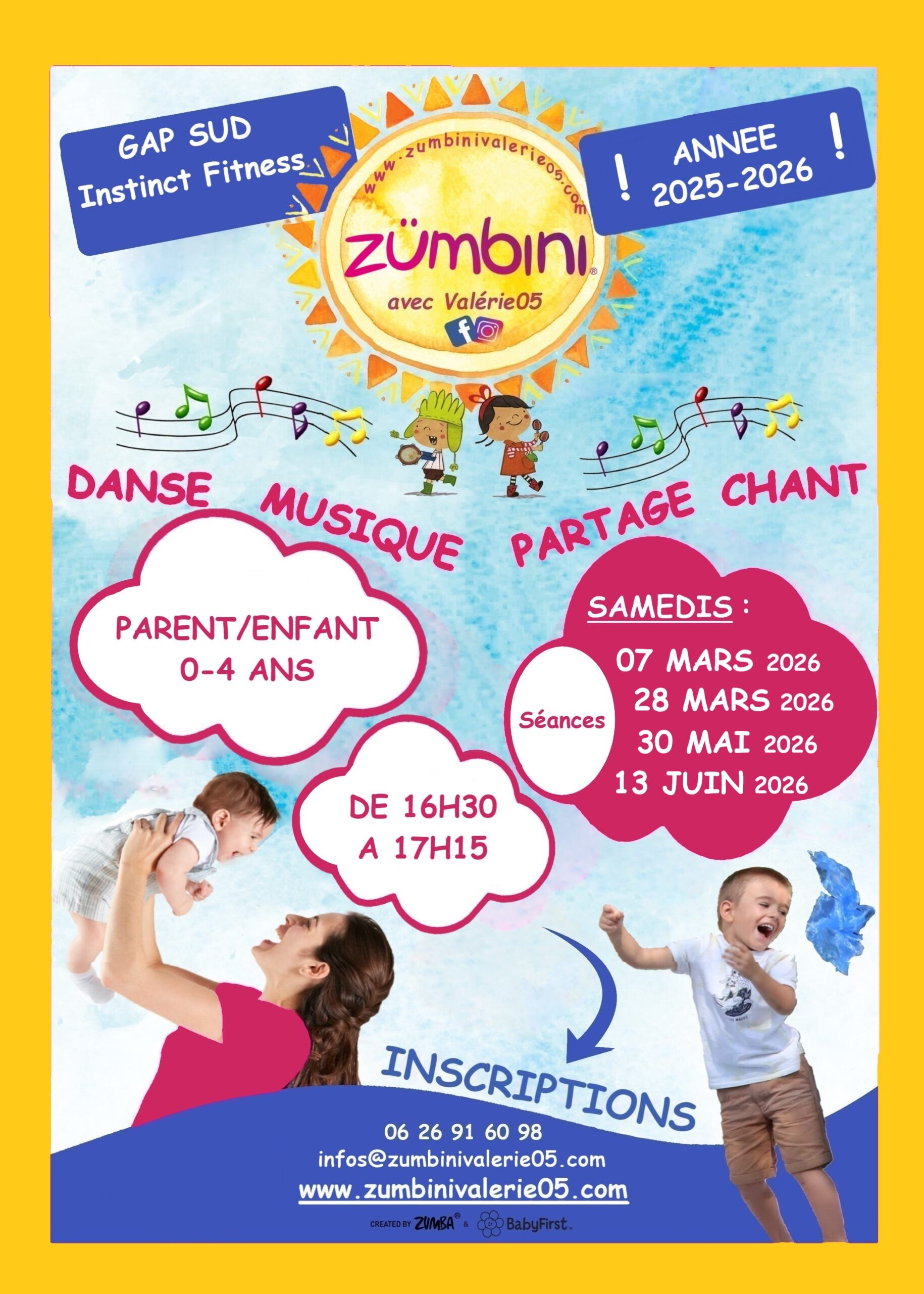 Activité proposée en français et en anglais avec de la musique, de la danse, du chant, des instruments et des foulards pour rendre heureux petits et grands durant 45 minutes !!! Rythmée par des musiques originales, la Zumbini est conçue pour stimuler le développement cognitif, social, psychomoteur et émotionnel de votre enfant, tout en créant un lien unique avec lui ! Cette activité Parent/Enfant de 0/4 ans vous offrira un véritable moment privilégié… Nouvelle session de printemps avec un nouveau programme, de nouveaux instruments et de nouvelles musiques. Bienvenue !!! Welcome !!!