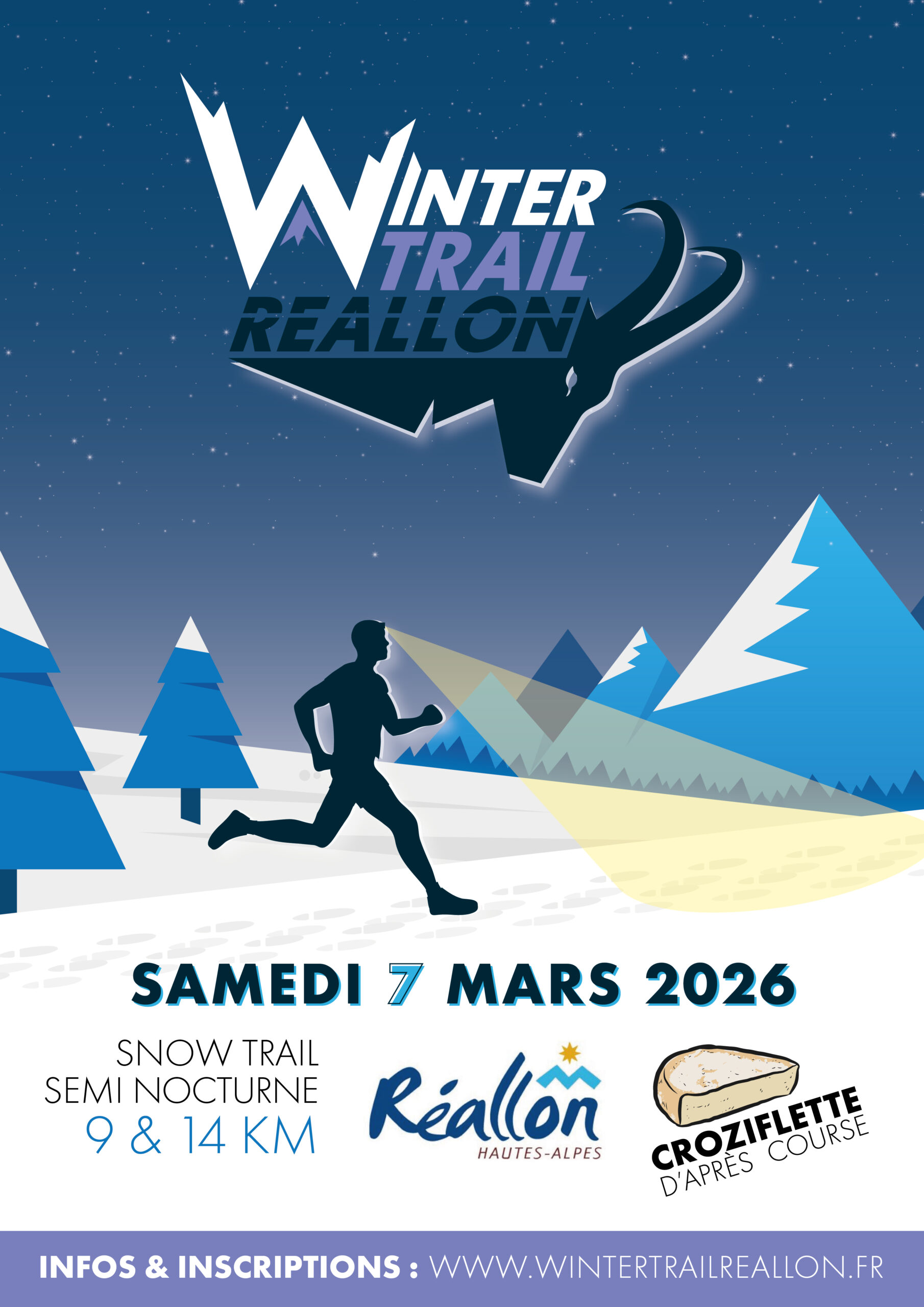 PROGRAMME 2026 Remise des dossards et inscriptions front de neige dans la station de 15h30 à 17h15. (jusqu’à 15minutes avant le départ) Parcours de Fond Renarde : Départ à 17h30 sur le front de neige. Parcours du Serre Mouton : Départ à 17h00 sur le front de neige. -Parcours de Fond Renarde : 9 km – 300m + 250 participants. Ce parcours vous mènera du front de neige de la station de Réallon aux confins de la vallée, par les sentiers sauvages de ces forêts enneigées. Le retour se fera par la piste de Vaucluse et le sentier des Oiseaux avant une plongée dans la station. Remise des dossards de 15h30 à 17h15 et Départ à 17h30. Ravitaillement d’arrivée + vin chaud offert (ou soft) Croziflette à réserver lors de l’inscription (pour vous et/ou vos accompagnants) Temps maximum pour être classé : 1h45 de course Podium : 19h00 -Parcours du Serre Mouton : 14 km – 550m + 250 participants. Un trail sur neige, mais un vrai trail de montagne, empruntant single, descentes de VTTistes, chemins de trappeurs et quelques pistes de ski. L’ascension jusqu’à Serre mouton par la cabane de Joubelle se mérite, mais la vue depuis les crêtes saura effacer toutes les douleurs, avant de plonger dans la station par les sentiers joueurs puis en fond de vallée pour une fin de course rapide et vallonée jusqu’à la ligne d’arrivée. Remise des dossards de 15h30 à 16h45 et Départ à 17h00 Ravitaillement d’arrivée + vin chaud offert (ou soft) Croziflette à réserver lors de l’inscription (pour vous et/ou vos accompagnants) Barrière horaire km 7 : 18h30 (1h30 de course) Temps maximum pour être classé : 2h30 de course Podium : 19h15 Croziflette Party Le trail c’est une chose… La croziflette s’en est une autre ! Notre fidèle partenaire : La spatule en bois sera de nouveau avec nous pour cette édition ! Leur cuisto nous préparera une belle Croziflette géante dans la salle de la Rama à côté de l’Office de Tourisme de la station. Coureurs, n’hésitez pas à prendre l’option Croziflette lors de votre inscription, mais vous pouvez également inscrire vos amis, votre famille pour partager encore un bon moment ! Il est également possible de s’inscrire à cette Croziflette sans aucun lien à cette course ! Il faut juste aimer le partage et les repas copieux ! ATTENTION : DATE LIMITE POUR VALIDER VOTRE DOSSIER : 1 mars 2026 Si votre dossier est incomplet à la date limite, votre inscription sera annulée sans remboursement.
