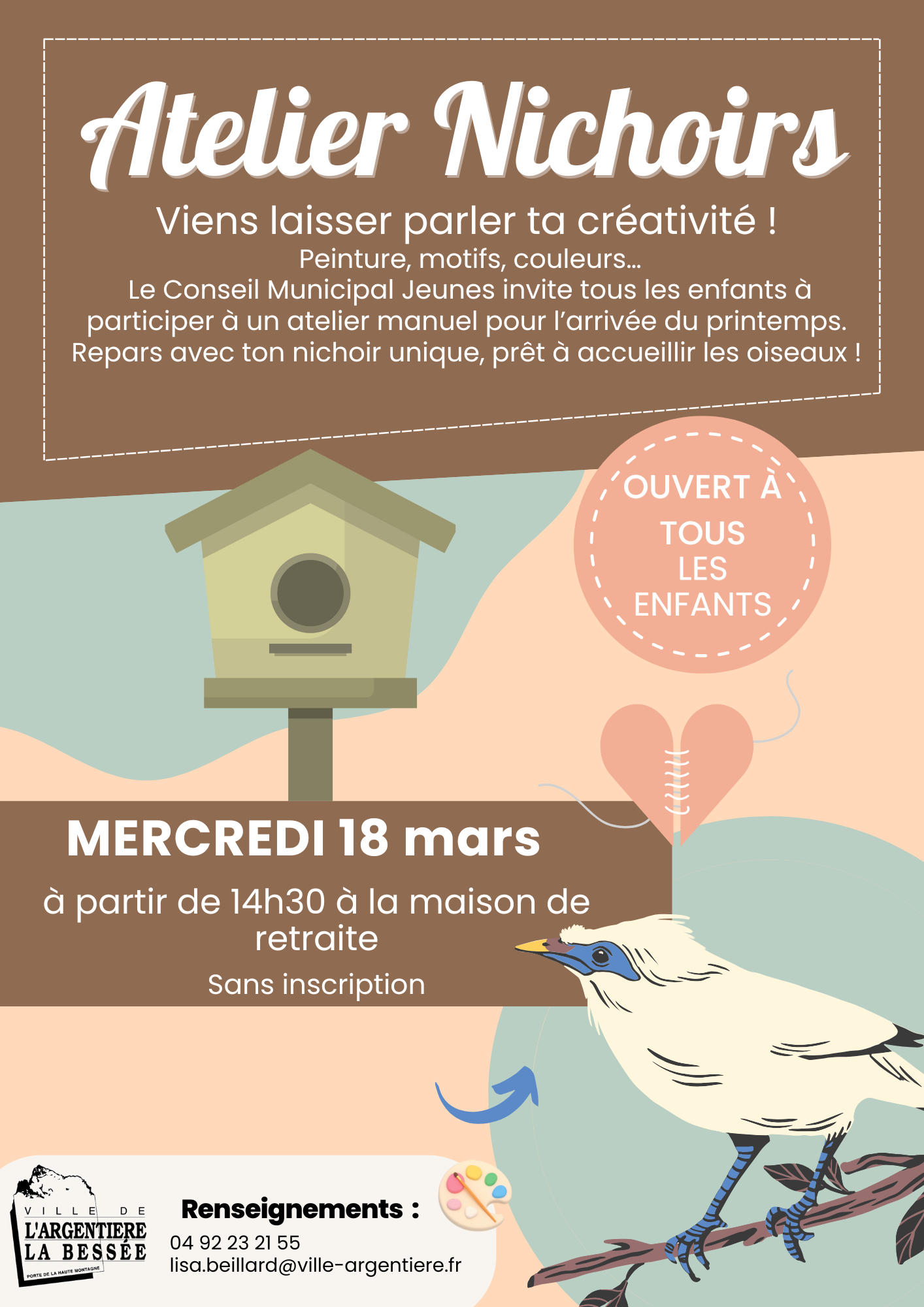 Dans le cadre de son initiative intergénérationnelle, les enfants du Conseil Municipal Jeunes et les élues membres de la commission scolaire et jeunesse, organisent un atelier de fabrication de nichoirs en collaboration avec les résidents de la maison de retraite Villa Montbrison. Cet atelier réunira résidents et jeunes afin de partager un moment créatif et convivial autour de la nature, pour l’arrivée du printemps. Les participants auront l’occasion de personnaliser et customiser des nichoirs en bois. Les enfants pourront repartir avec, et les résidents installeront les leurs dans les espaces extérieurs de la maison de retraite. Cet atelier est sans inscription, ouvert à tous les enfants.