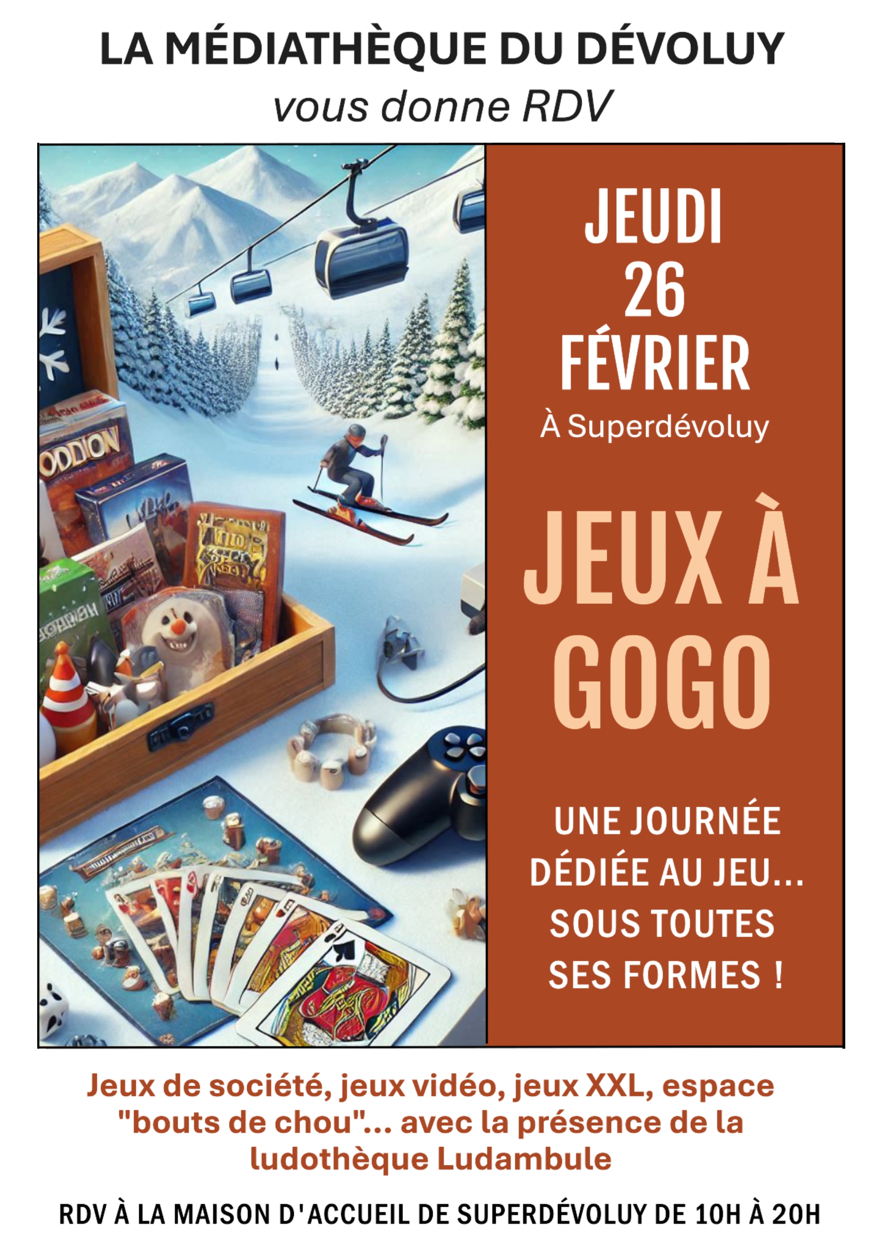 Au programme : > JEUX DE SOCIÉTÉ – Dès 10h Venez jouer et partager de bons moments ! Des animateurs vous feront découvrir des jeux d’ambiance, de coopération ou de stratégie. > ESPACE “BOUTS DE CHOU” – Dès 10h Un espace spécialement aménagé pour les tout-petits avec des jeux adaptés à leur âge. > JEUX VIDÉO – 14h30 à 19h Consoles et jeux variés pour petits et grands. Testez vos compétences ou amusez-vous entre amis ! > JEUX XXL – 14h30 à 19h Des jeux en grand format pour encore plus de rires et de défis, en famille ou entre amis. > PAUSE GOÛTER / DÉJEUNER Apportez vos encas, nous offrons les boissons ! Rendez-vous à la Médiathèque du Dévoluy