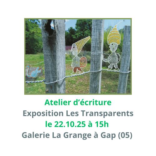 Dans le cadre de l’exposition à la galerie La Grange à Gap, du 14 au 25 octobre 2025, Gislaine Ariey animera un atelier d’écriture destiné aux adultes le 22 octobre 2025 de 15h à 17h30 : – comprenant une visite guidée et un temps d’écriture, – 5 participants minimum, 10 participants maximum, – matériel fourni, – ouvert à toutes et tous ! – participation : 25 euros/personne. – animé par Gislaine Ariey, écrivaine biographe, animatrice d’ateliers d’écriture et de création, chargée d’enseignement à l’Université de Toulon. Lieu de rendez-vous : Galerie La Grange – 16, La Placette – 05000 Gap à 15h La contacter pour obtenir tout renseignement complémentaire.