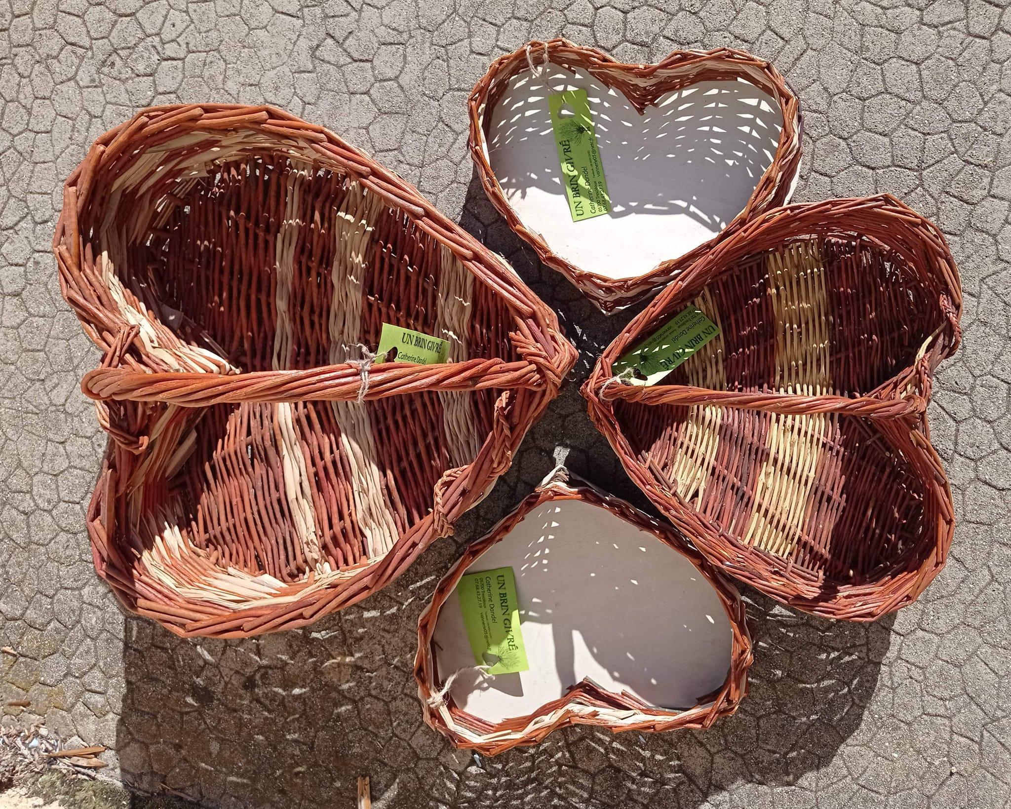 Techniques abordées : – corbeille ronde asymétrique : fond sur croisé, insertion montant, tressage en torche puis crocane, clôture asymétrique. – corbeille cœur : moule et remplissage du fond à brin suivis, écaffe et ourdissage des montants, torche, crocane et bordure .