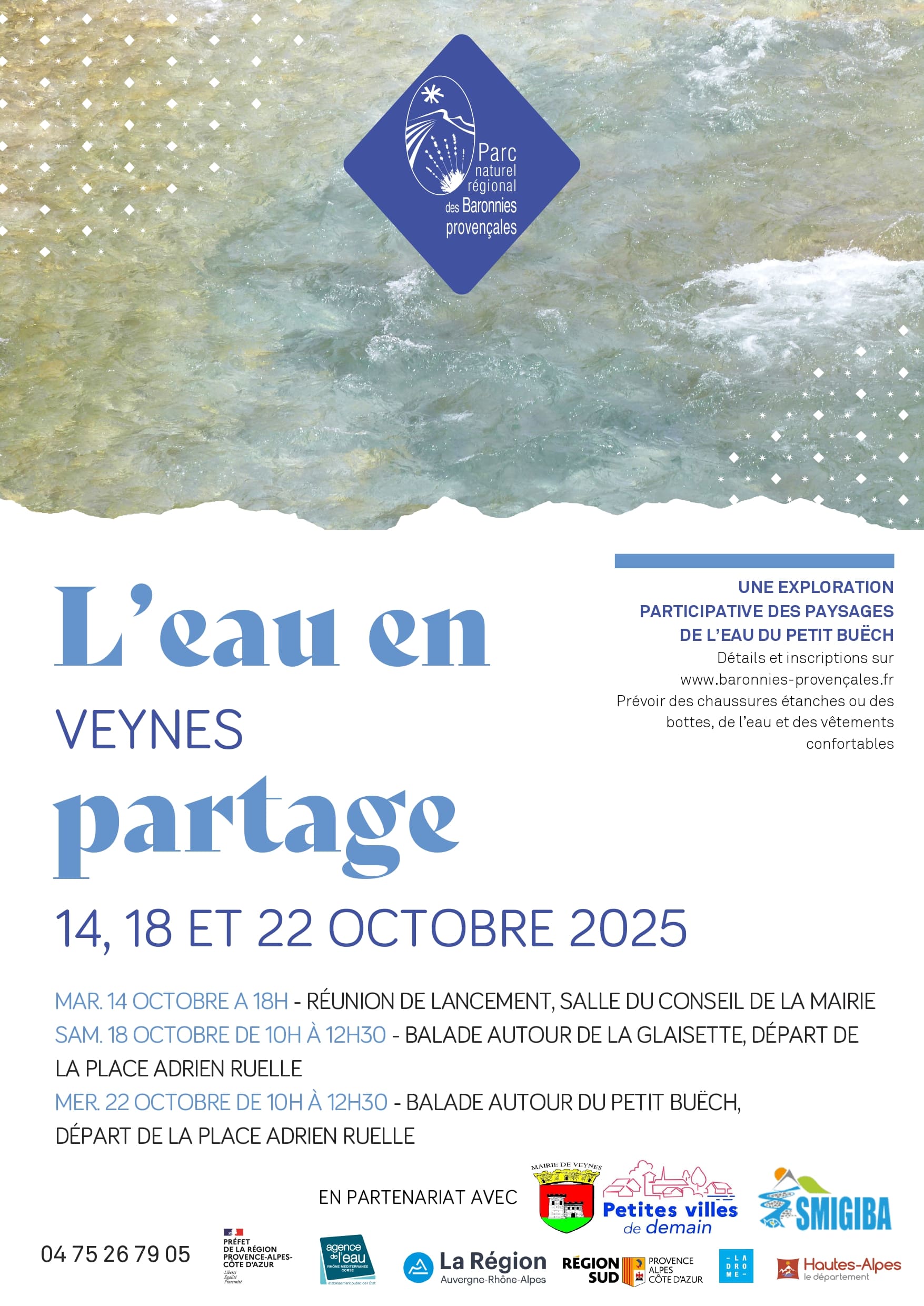 Dans le pays du Buëch, l’eau dévale des torrents de montagne, plonge dans les alluvions, se ramifie dans le lit de la rivière, accélère entre les digues, dérive et ralentit dans les canaux d’irrigation, s’infiltre dans les marais… A certaines périodes de l’année, elle se fait rare, à d’autres, elle est partout. Les différents usages et aménagement humains influencent son cheminement, sa vitesse, son débit, sa qualité et la vie qu’elle abrite. Son juste partage, entre les usages humains et avec le reste du vivant, fait l’objet de controverses et de négociations. La bonne santé des rivières devient un sujet de préoccupation majeur. Alors, comment fonctionne le petit Buëch ? Comment se porte-il ? Que lui avons-nous fait ? Quels sont nos liens à lui ? Où commence-t-il et où finit-il ? Comment en prendre soin ? Animée par Charlotte Némoz, artiste en résidence à Veynes, cette démarche d’enquête et de création collective se matérialisera par l’organisation de balades, d’ateliers et de débats à la découverte de la mosaïque d’écosystèmes, de paysages et d’usages de l’eau du petit Buëch. Elle vise à impliquer les habitants ainsi qu’à réunir les différents acteurs concernés par le milieu rivière et par la gestion de l’eau sur le territoire. Ce projet se déroulera d’octobre 2025 à mai 2026 dans le cadre d’une résidence de création-transmission financée dans le cadre du dispositif « Terres de légendes » de la Direction Régionale des Affaires Culturelles Provence-Alpes-Côte d’Azur et de l’appel à projet « Eau et participation citoyenne » de l’Agence de l’eau Rhône-Méditerranée-Corse. Prévoir des chaussures étanches ou des bottes, de l’eau et des vêtements confortables.