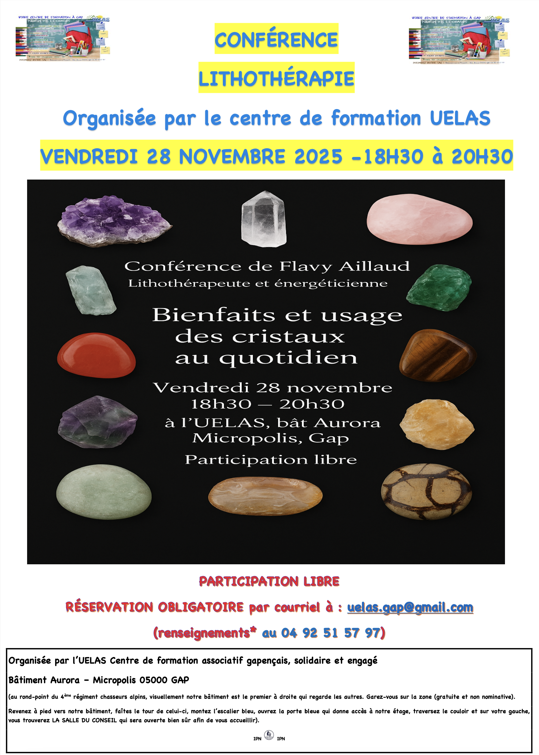 Conférence animée par Flavy Aillaud, Lithothérapeute et énergéticienne Bienfaits et usage des cristaux au quotidien Une conférence passionnante et très pratique ! Inscriptions obligatoires