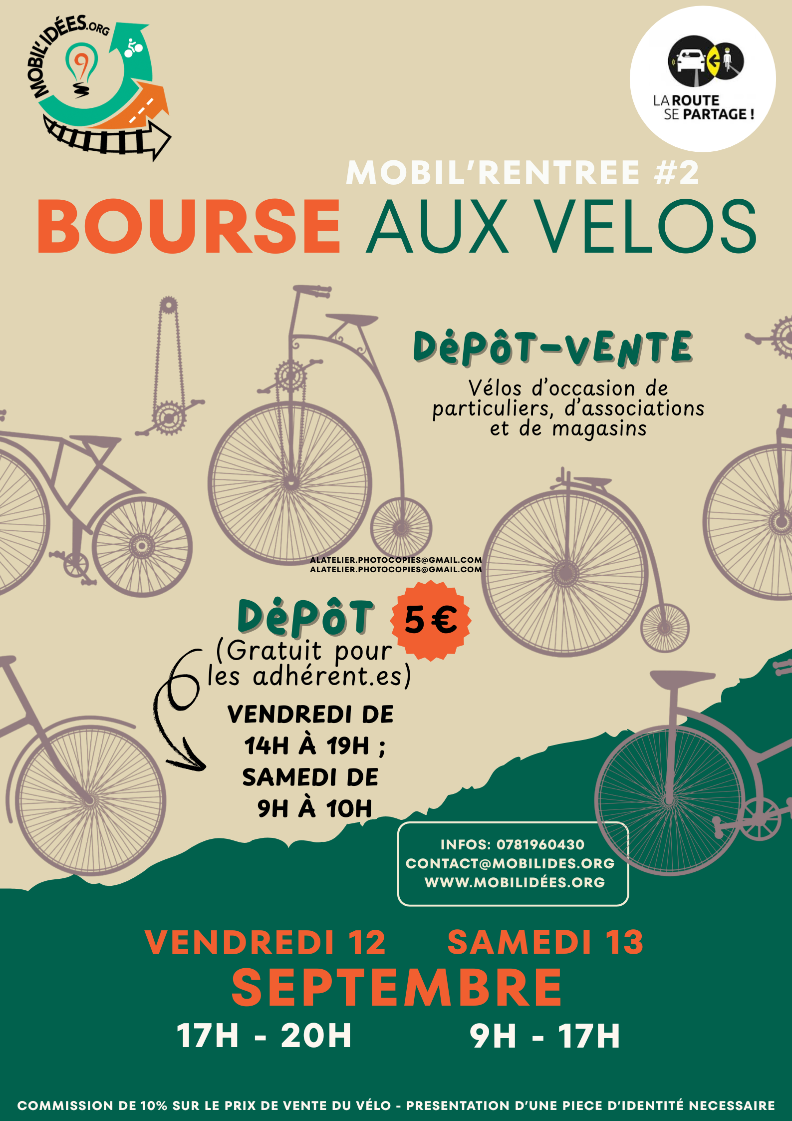 L’association Mobil’idées donne rendez-vous aux habitants les vendredi 12 et samedi 13 septembre, 5-7 Place Jules Ferry à Gap, pour sa bourse au vélos d’automne. Le dépôt des vélos se fera le vendredi 12 septembre de 14h à 19h, ou le samedi 13 septembre de 9h à 10h. Le dépôt est gratuit pour les adhérents (5€ pour les non-adhérents) et se fera sur présentation d’une pièce d’identité. La vente se tiendra dans la foulée, le vendredi de 17h à 20h, et le samedi de 9h à 17h. Une commission de 10 % sera prélevée sur le prix de vente.