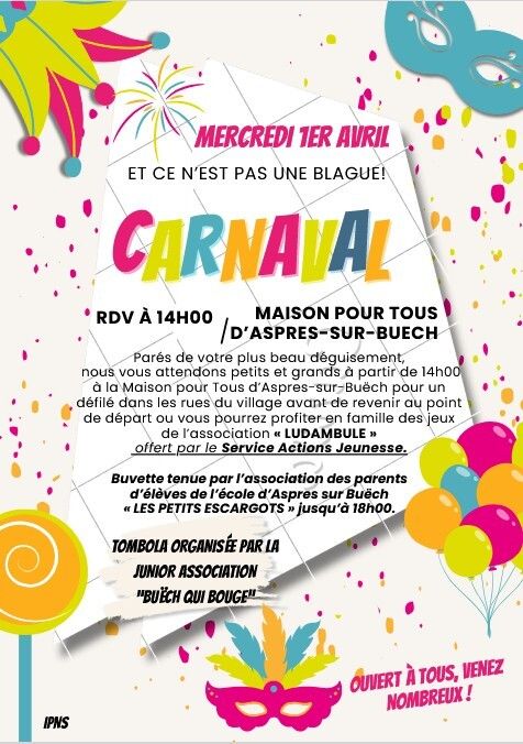 Offert par le Service Actions jeunesse, cet après mdi festif accueillera également un buvette tenue par l’association des parents d’élèves de l’école d’Aspres sur Buech “Les Petits Escargots” jusqu’à 18h Tombola organisée par la Junior Association “Buëch qui Bouge”