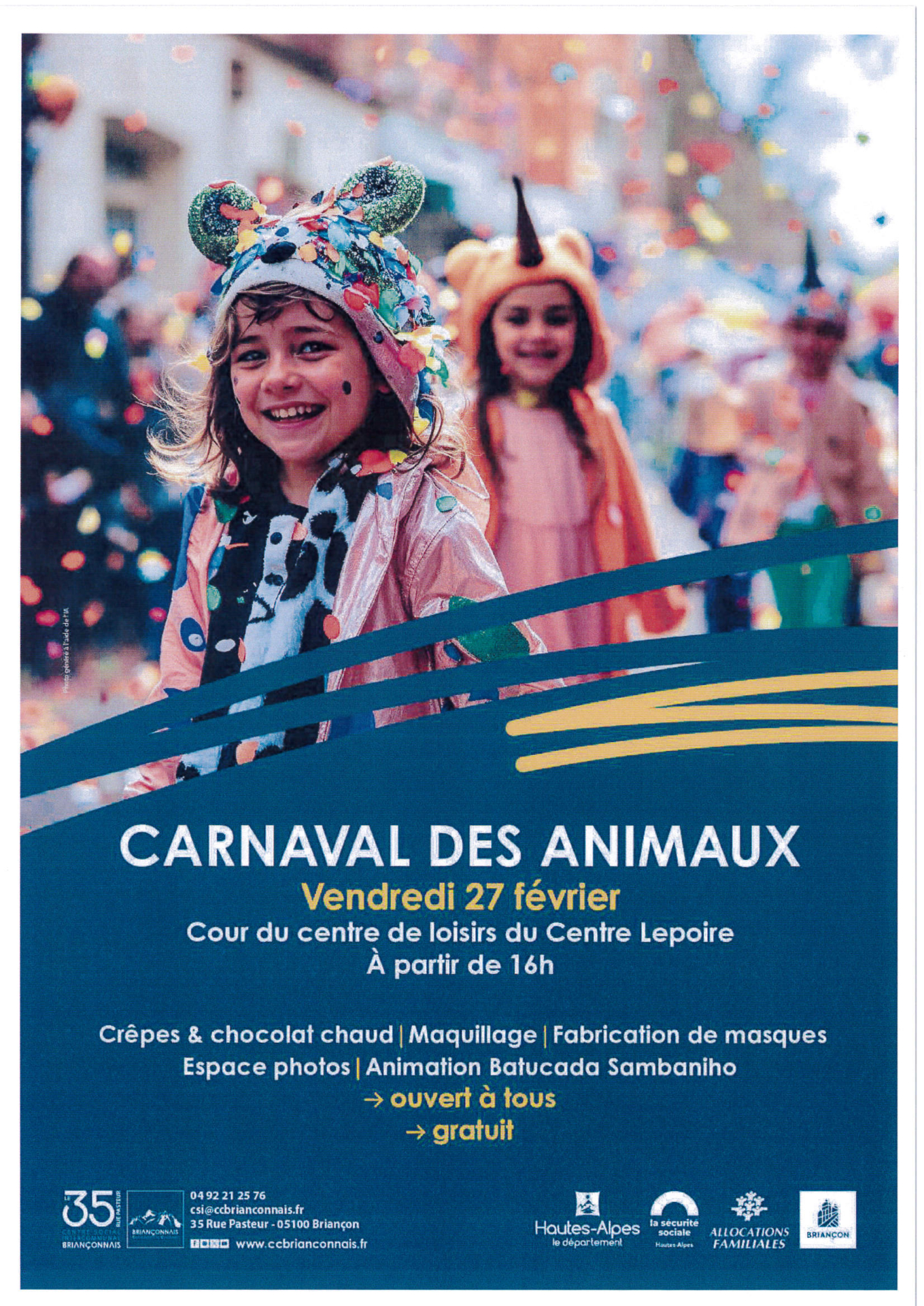 Le Carnaval des animaux s’installe à Briançon. Au programme : maquillage, fabrication de masques, animations, espaces photos, animation Batucada Sambaniho. Sans oublier des crêpes et chocolats chauds. Ouvert à tous.