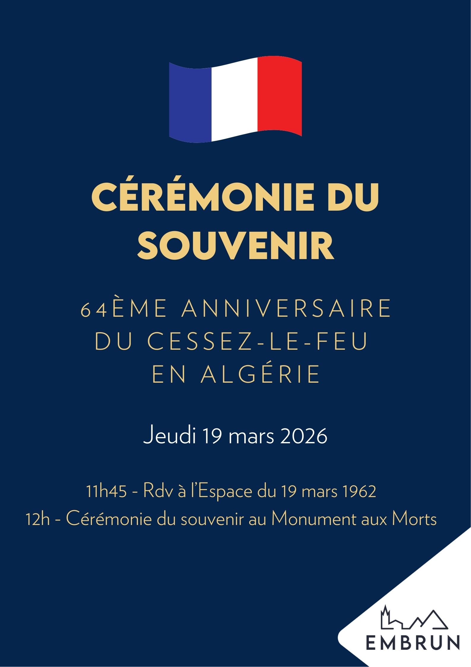 Le départ du cortège est prévu à 11h45 depuis l’Espace du 19 mars 1962. Il empruntera ensuite la rue Jean de Lattre de Tassigny et l’avenue de Verdun. La cérémonie débutera à 12h00 au Monument aux Morts.