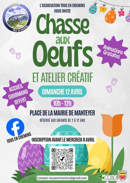 L’association “Tous en Chemins” a le plaisir de proposer à tous les enfants de Manteyer (maternelle et primaire) une chasse aux oeufs dans le quartier de la Mairie. Les enfants sont sous la responsabilité des parents pendant toute la manifestation. L’agenda est le suivant : 10h à 10h30 : Accueil : Boissons, fruits (pour enfants et parents) 10h30 à 11h : Chasse à l’oeuf (en bois) dans le secteur de la mairie 11h 15 : Remise des récompenses (tous les enfants auront leur ballotin de chocolat) et atelier déco 11h 45 : Fin de la manifestation. En cas de mauvais temps, la manifestation sera maintenue et se déroulera à l’intérieur de la Mairie (atelier peinture sur les oeufs, …) Pour pouvoir prévoir l’accueil dans les meilleures conditions, merci de compléter le formulaire suivant avec quelques informations sur votre participation. Un mail confirmant votre participation vous sera envoyé. Pour plus d’informations, contactez-nous au 06.86.42.23.23 ou à l’adresse tousenchemins@gmail.com
