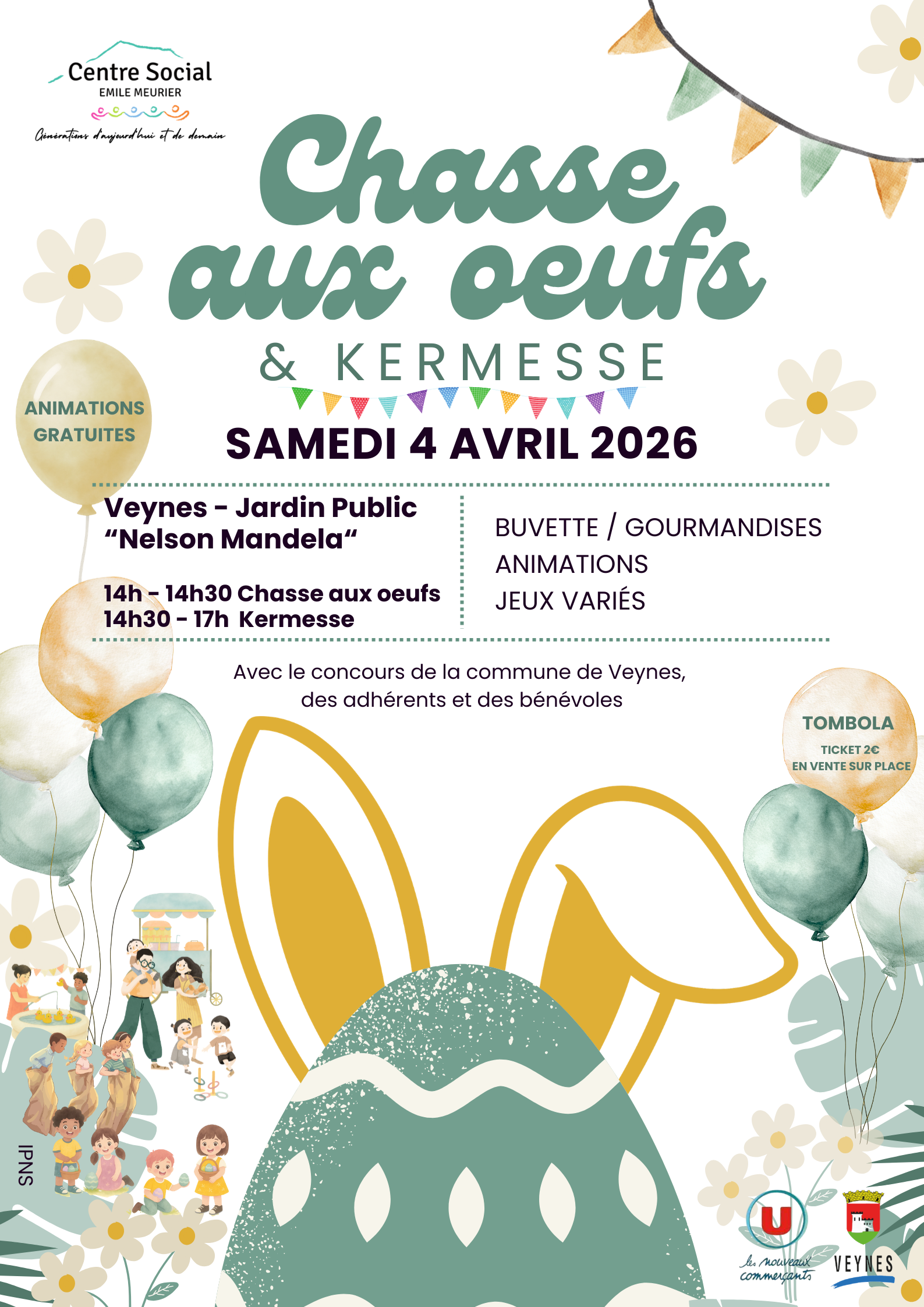 Cette manifestation, dont l’accès est gratuit, se déroulera au jardin public Nelson Mandela de Veynes à partir de 14h et jusqu’à 17h. En début d’après-midi, deux chasses aux œufs successives seront organisées (une pour les jeunes enfants et une autre pour les enfants de plus de 6 ans). Suivra une kermesse avec différents stands : pêche aux canards, tir au but, course en sac, chamboule tout, tir à l’arc, parcours miroir … Au cours de l’après-midi, un goûter sera offert par les Ets Super U de Veynes, aux enfants ayant participé à la chasse aux œufs et aux différents challenges de la kermesse. Buvette et gourmandises tout au long de l’après-midi. Informations : Centre Social “Emile Meurier” : 04.92.58.16.58 ou csveynes.secretariat@gmail.com