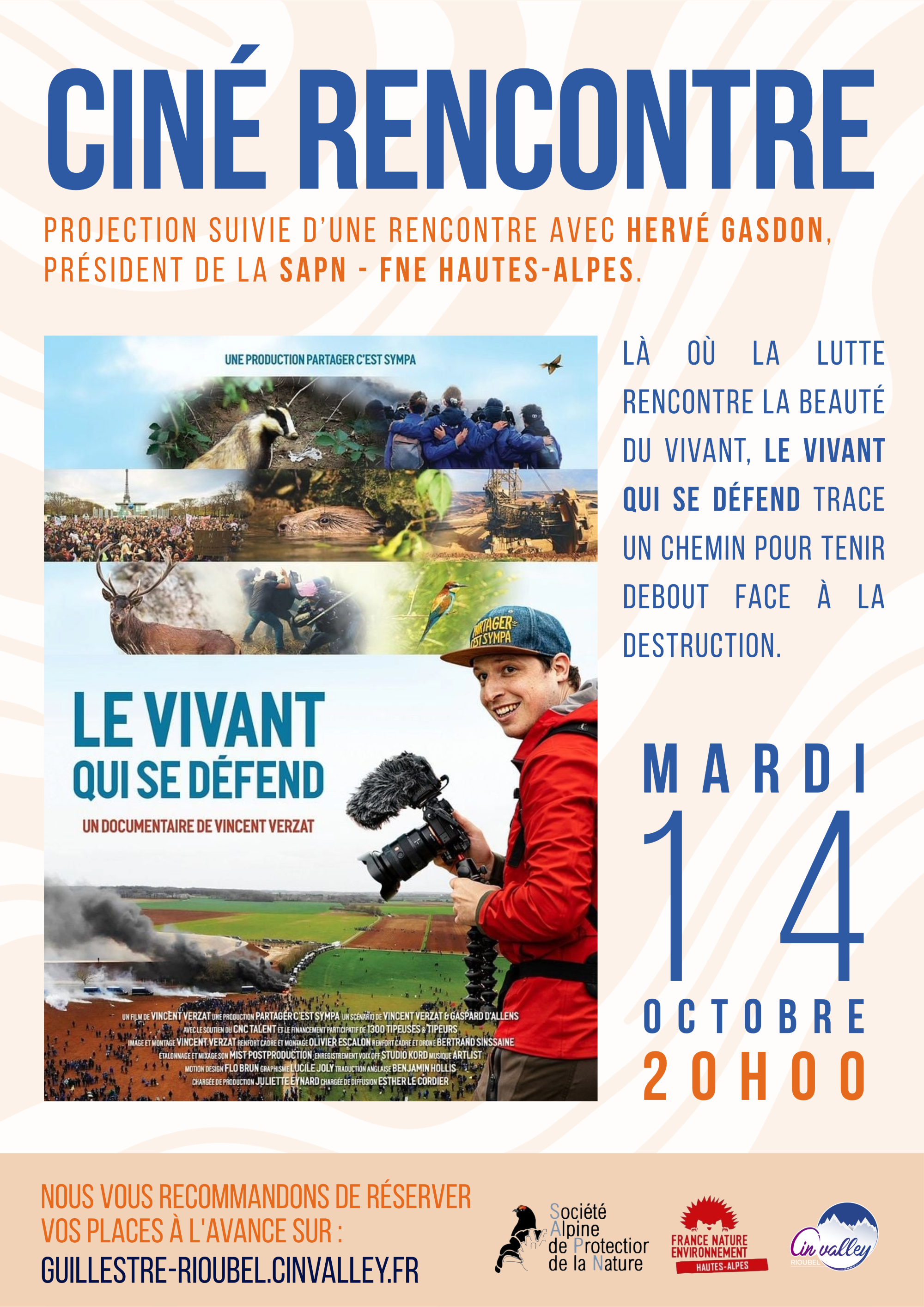 Projection suivie d’un moment d’échange avec Hervé Gasdon, président de la SAPN. Synopsis :Vincent Verzat filme les mobilisations écologiques depuis 10 ans sur la chaîne YouTube Partager c’est Sympa. Partant d’un récit personnel et sensible, le film retrace son cheminement entre militantisme et naturalisme, sa recherche d’un équilibre entre combat et contemplation. Des luttes forestières du plateau des Millevaches à la tanière d’une famille de blaireaux, en passant par les méga-bassines du Poitou, les cerfs du Vercors et l’autoroute A69, Le VIVANT qui se défend relie la cause animale aux luttes menées partout en France contre la destruction des habitats naturels. L’objectif de cette soirée : Cette avant-première, bien qu’elle ne se déroule pas en présence du réalisateur, s’inscrit dans l’esprit de la tournée autogérée du film “Le VIVANT qui se défend”. Elle a pour ambition de mettre en lumière les associations locales qui œuvrent concrètement pour la protection du vivant.