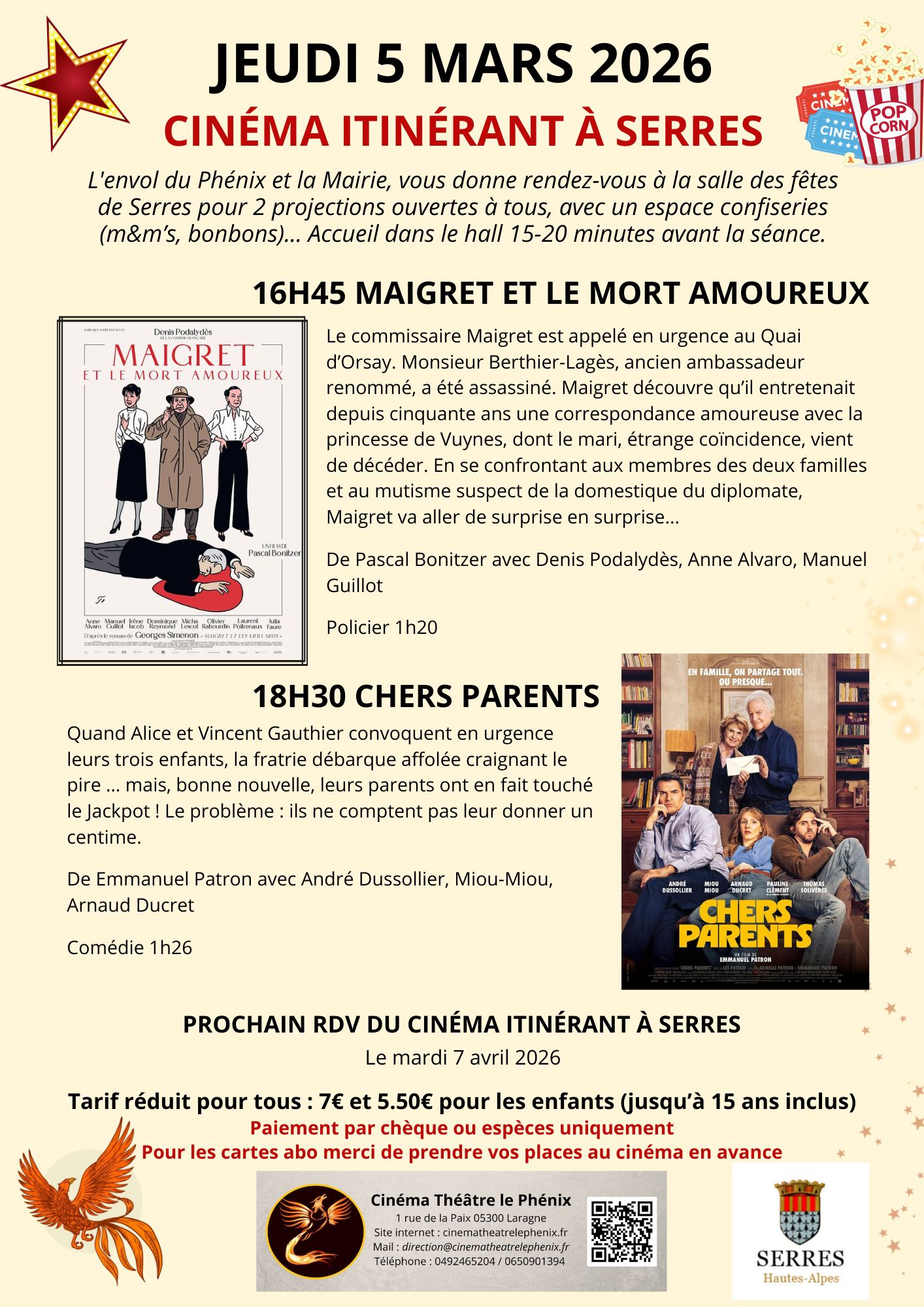 Maigret et le mort amoureux Policier de Pascal Bonitzer, avec Denis Podalydès, Anne Alvaro, Manuel Guillot Le commissaire Maigret est appelé en urgence au Quai d’Orsay. Monsieur Berthier-Lagès, ancien ambassadeur renommé, a été assassiné. Maigret découvre qu’il entretenait depuis cinquante ans une correspondance amoureuse avec la princesse de Vuynes, dont le mari, étrange coïncidence, vient de décéder. En se confrontant aux membres des deux familles et au mutisme suspect de la domestique du diplomate, Maigret va aller de surprise en surprise… Chers parents Comédie de Emmanuel Patron, avec André Dussollier, Miou-Miou, Arnaud Ducret Quand Alice et Vincent Gauthier convoquent en urgence leurs trois enfants, la fratrie débarque affolée craignant le pire … mais, bonne nouvelle, leurs parents ont en fait touché le Jackpot ! Le problème : ils ne comptent pas leur donner un centime. Accueil dans le hall 15-20 minutes avant la séance.