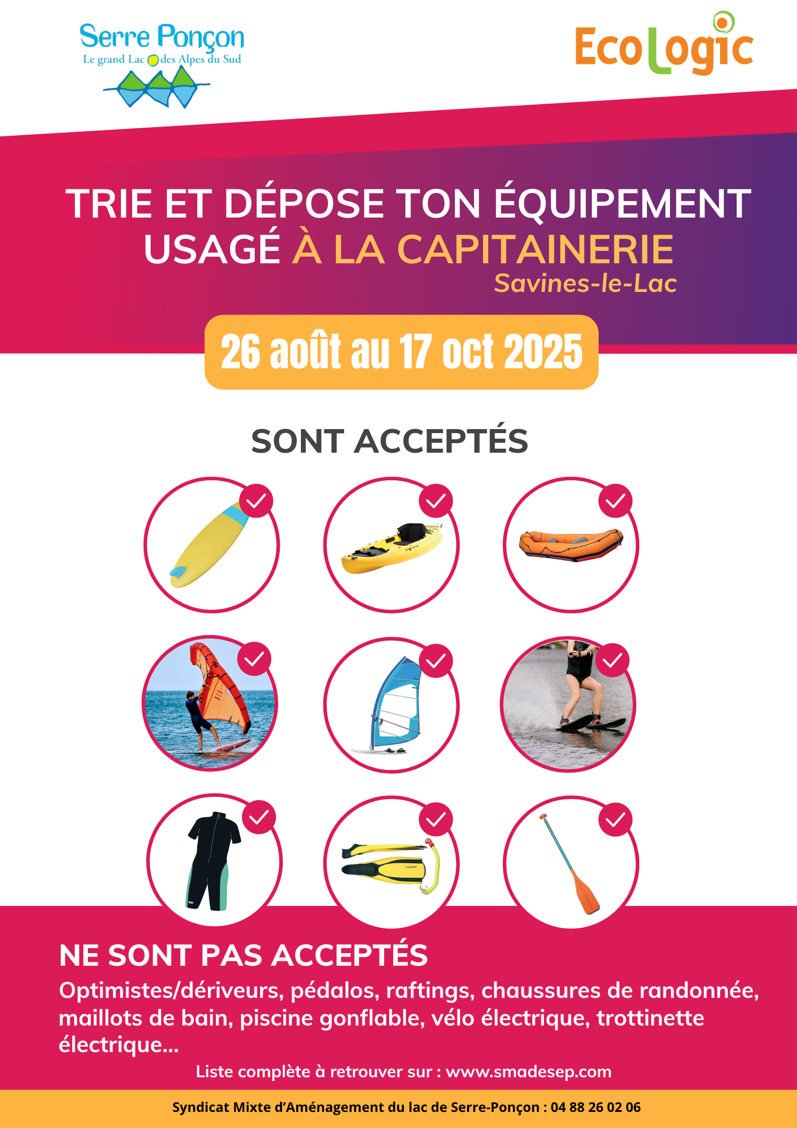 Une benne est disponible au Port à Sec de la Capitainerie à Savines-le-Lac, pour y déposer les articles de Sports et de Loisirs usagés. Quels matériels peut-on déposer ? Nous acceptons les planches à voile, les ailes, les mats de windsurf, les pagaies, les rames, les planches de kite, les skis nautiques, les wakeboards, les casques, les kayaks, les paddles, les gilets de sauvetage, les combinaisons de plongée, les masques et tubas, mais aussi vélo, raquettes ainsi que tous les autres équipements de sport et loisirs (à l’exception des textiles et des sneakers). En cas de doute, consulter la liste de tous les équipements acceptés lors de cette collecte : https://www.smadesep.com/sites/default/files/documents/2025-08/liste-produits-asl-2024.pdf Que deviennent ces articles de sport ? Les équipements trop usés ou hors d’usage seront recyclés ou valorisés pour produire de l’énergie. Ceux en bon état ou réparables seront remis à des associations ou des recycleries pour vivre une seconde vie, offrant ainsi une opportunité à des personnes en situation de précarité de s’équiper. Pour en savoir plus sur le processus et l’impact écologique de cette démarche, consultez le lien suivant : https://www.ecologic-france.com/ecologic/filiere-asl/que-deviennent-asl.html Qui est Ecologic ? Ecologic est un éco-organisme agréé par l’État pour piloter plusieurs filières nationales de prévention et de recyclage de produits usagés ou en fin de vie. Depuis 2006, Ecologic contribue au développement d’une économie circulaire en mobilisant l’ensemble des acteurs impliqués.