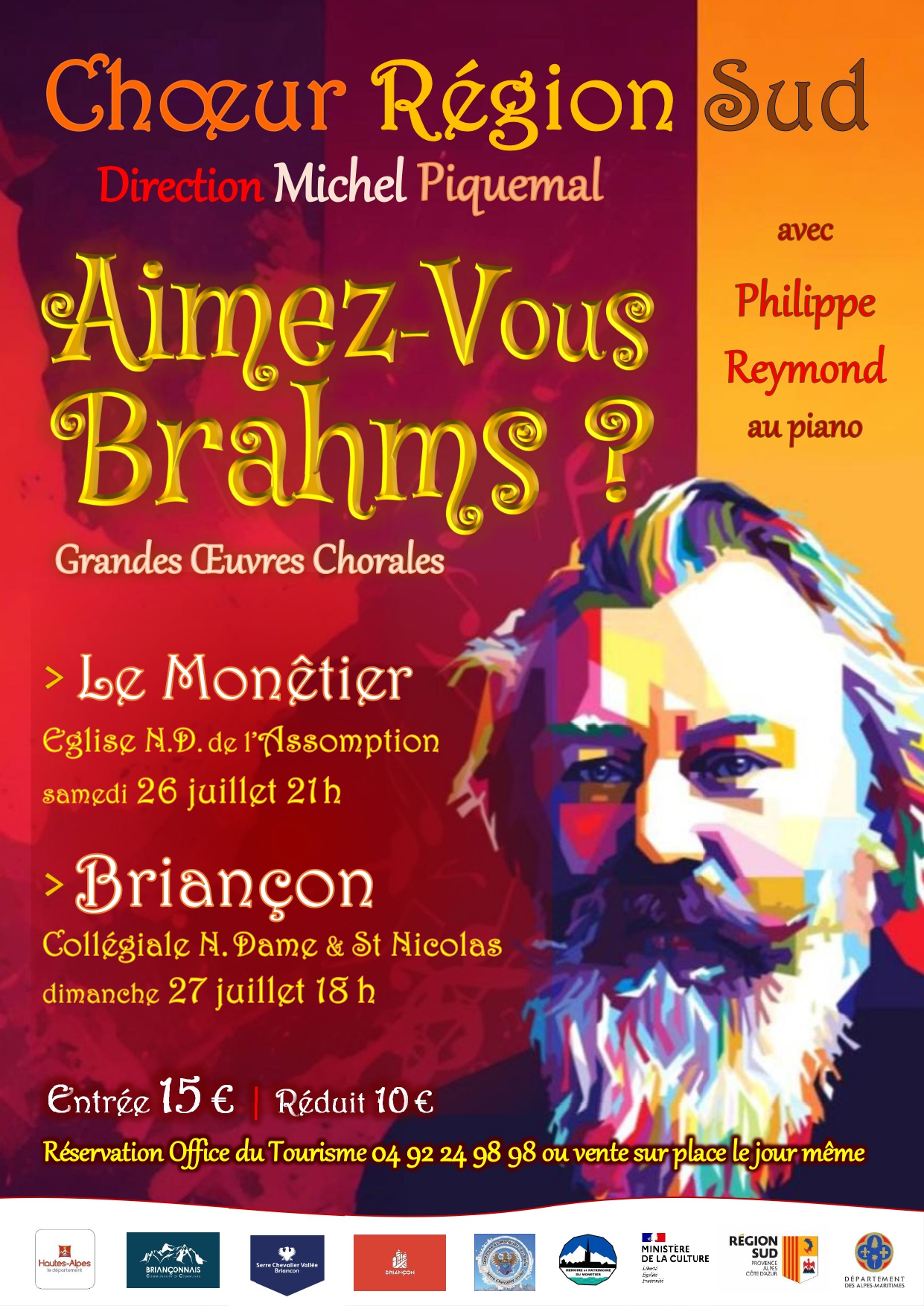 Comme depuis plusieurs étés désormais, le Chœur Région Sud se rendra dans le département des Hautes-Alpes pour deux concerts. « La musique pour chœur et orchestre est la plus haute expression de la musique » affirmait Robert Schumann. L’œuvre de Brahms illustre à merveille ce propos. Lui qui fut chef de chœur, excelle dans l’art d’utiliser les ressources de la voix et du chant choral, donnant à chaque pièce une forte charge émotionnelle. Tantôt sereins et lumineux, tantôt sombres et tourmentés, sacrés ou profanes, ces chants transcendent les forces antagonistes du classicisme et du romantisme dans une harmonieuse unité. Un intermède pianistique autour des intermezzi ajoute à ce concert vocal tendresse et nostalgie.