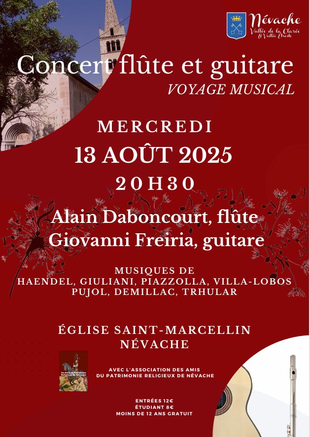 Dans le cadre enchanteur de l’église Saint-Marcellin à Névache, vivez une soirée musicale hors du temps avec le duo formé par Alain Daboncourt à la flûte et Giovanni Freiria à la guitare. De Haendel à Villa-Lobos, en passant par Piazzolla, Pujol ou encore Demillac, les œuvres choisies vous emmèneront à travers les époques et les continents. Une parenthèse artistique pleine de poésie, proposée par l’Association des Amis du Patrimoine Religieux de Névache.