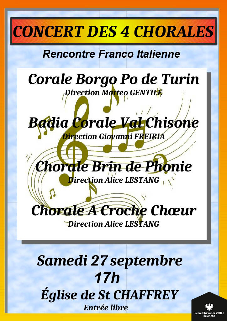 Corale Borgo Po de Turin Direction Matteo Gentile Badia Corale Val Chisone Direction Giovanni Freiria Chorale Brin de Phonie Direction Alice Lestang Chorale A Croche Choeur Direction Alice Lestang