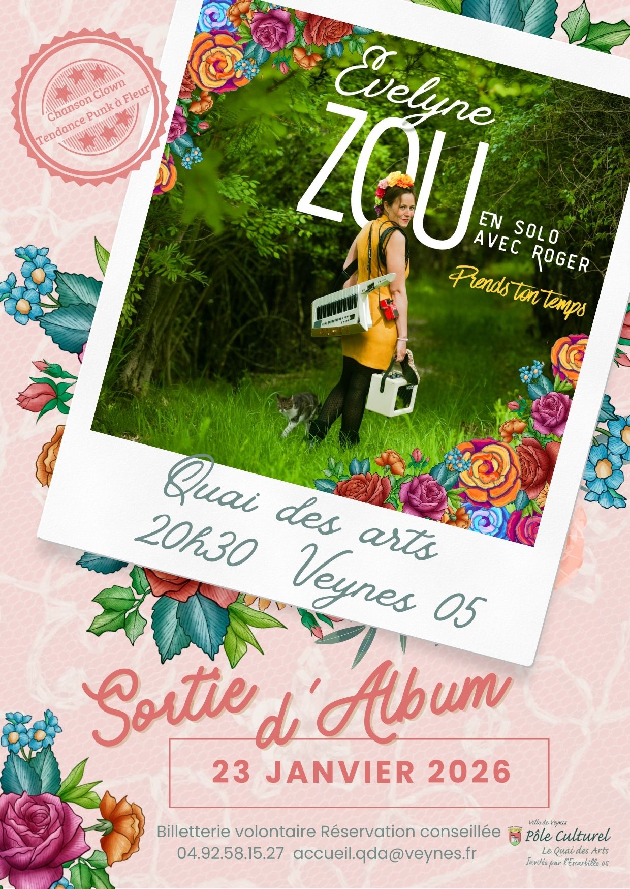 “Cher public, je te présente mon nouvel album : “Prends ton temps ” Il sortira en janvier, et pour cette occasion, avec Roger, on va te faire un super spectacle au quai des arts à Veynes (05) Alors réserves ta soirée et viens !” Billetterie volontaire réservation conseillé : 0492581527 accueil.qda@veynes.fr.