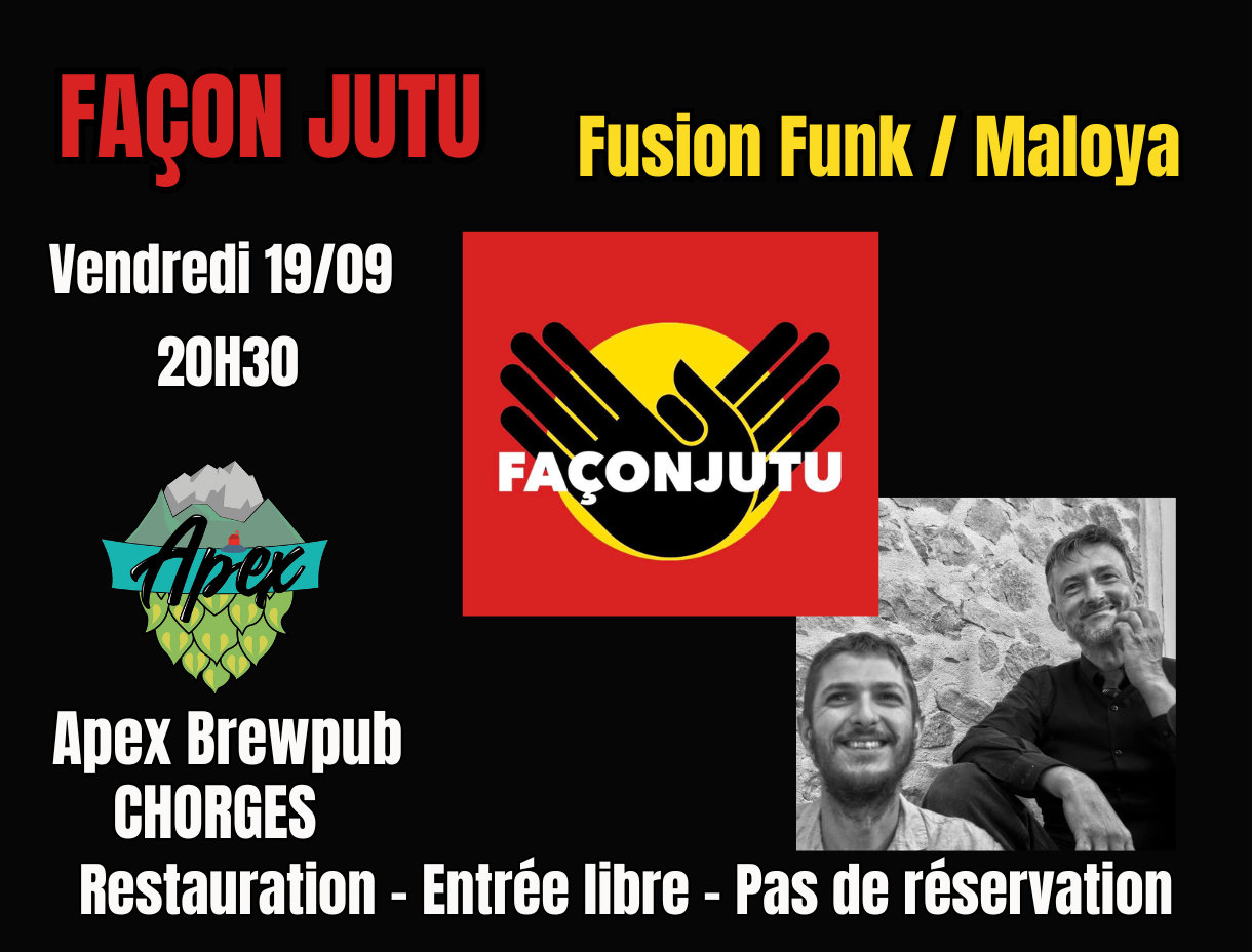 Ce soir ce sera Façon Jutu, un duo en tournée chez nous, venant tout droit de la Ciotat. Ils proposent un concert énergique et festif, entre Funk et Maloya ! Un beau moment en perspective. Restauration sur place Pas de réservation Entrée libre