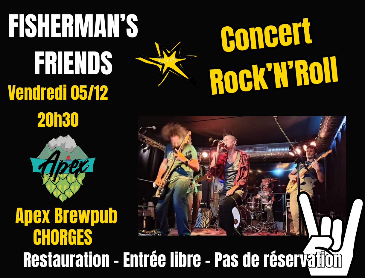 Attention les murs vont trembler ! Comme chaque hiver d’ailleurs ! Enfiler vos baskets et vos jeans troués, ramenez vos potes et votre bonne humeur, les Fisherman’s s’occupent du reste ! Avec leur énergie débordante, ils sauront toujours vous faire crier, danser, sauter, pogoter… ! Une soirée toujours mémorable ! Les Fisherman’s Friends c’est qui ? Le groupe du coin à la notoriété croissante, toujours présent pour allumer la foule! Avec leurs reprises péchues et leur énergie brute, ils sauront vous plonger dans un univers rock’n’roll teinté de folie et de puissance, parfait pour cette soirée si particulière. Côté pub on s’occupe du reste, nombreuses bières éphémères à la pression, restauration sur place avec notre cuisinier… il ne manque plus que vous ! Restauration sur place.