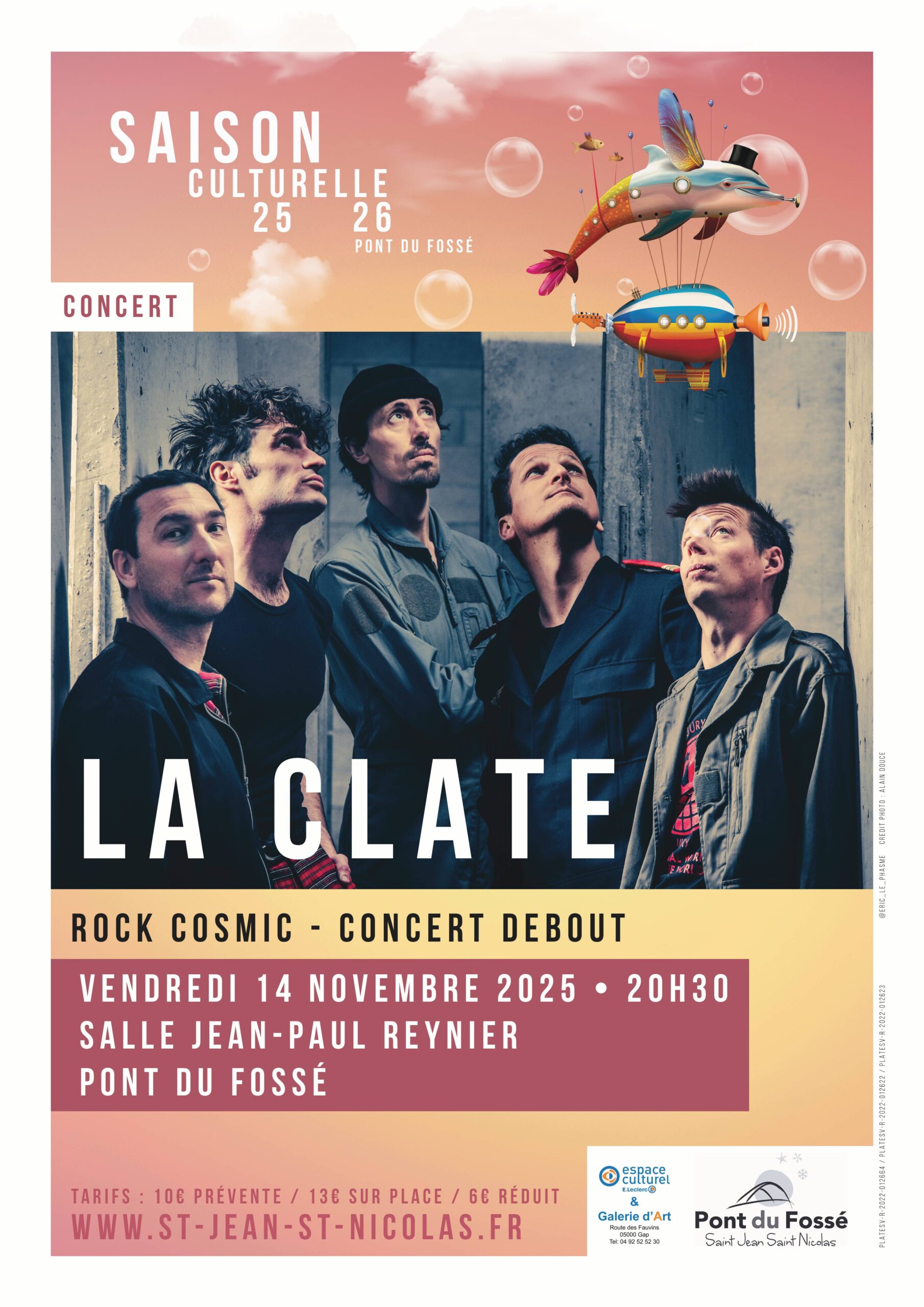 La clate Rock cosmic Fondée en 2021, La Clate est une formation cuivrée atypique résolument rock n’ roll. Cinq musiciens aux profils et horizons multiples : une section cuivre sax-trompette des plus tonitruantes, accompagnée d’un guitariste déchaîné, le tout porté par un impitoyable duo rythmique au sax basse et à la batterie. Si le groupe franco-britannique se définit comme un groupe de rock, il n’en explore pas moins d’autres univers et se plaît à fusionner les genres. Il en ressort des compositions métissées dont les influences, du rock anglais à l’afrobeat, sont nombreuses (comme The Hives, Arctic Monkeys, Fela Kuti, Franck Zappa, La Jungle ou encore Philippe Katerine). De cet éclectisme, La Clate fait une force et nous tient en haleine tout au long d’un show furieusement endiablé. lle nous invite au coeur de son univers décalé et fantasque où les musiciens se muent en une bande d’extraterrestres qui, à bord de leur fusée d’occaz, dépeignent au travers de textes hilares et caustiques les incohérences et les absurdités de notre société moderne. Un cocktail explosif idéal pour survitaminer vos soirées ! A ne manquer sous aucun prétexte.