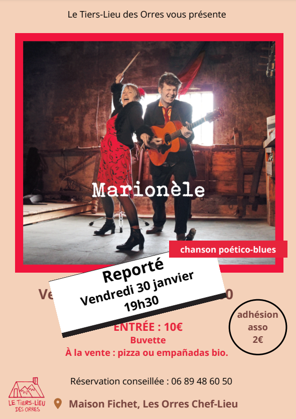 Baffe ou mouche, cet album vient gentiment nous titiller : c’est doux acidulé, c’est lucide et bien dosé. Un album parfait pour faire s’envoler la morosité. Agnès André ( Nos Enchanteurs) 16 Mai 2023. Buvette. À la vente : pizza ou empanadas bio. Retrouvez le programme complet du Tiers-lieu : https://www.lesorres.com/activites-et-animations/le-tiers-lieu-des-orres