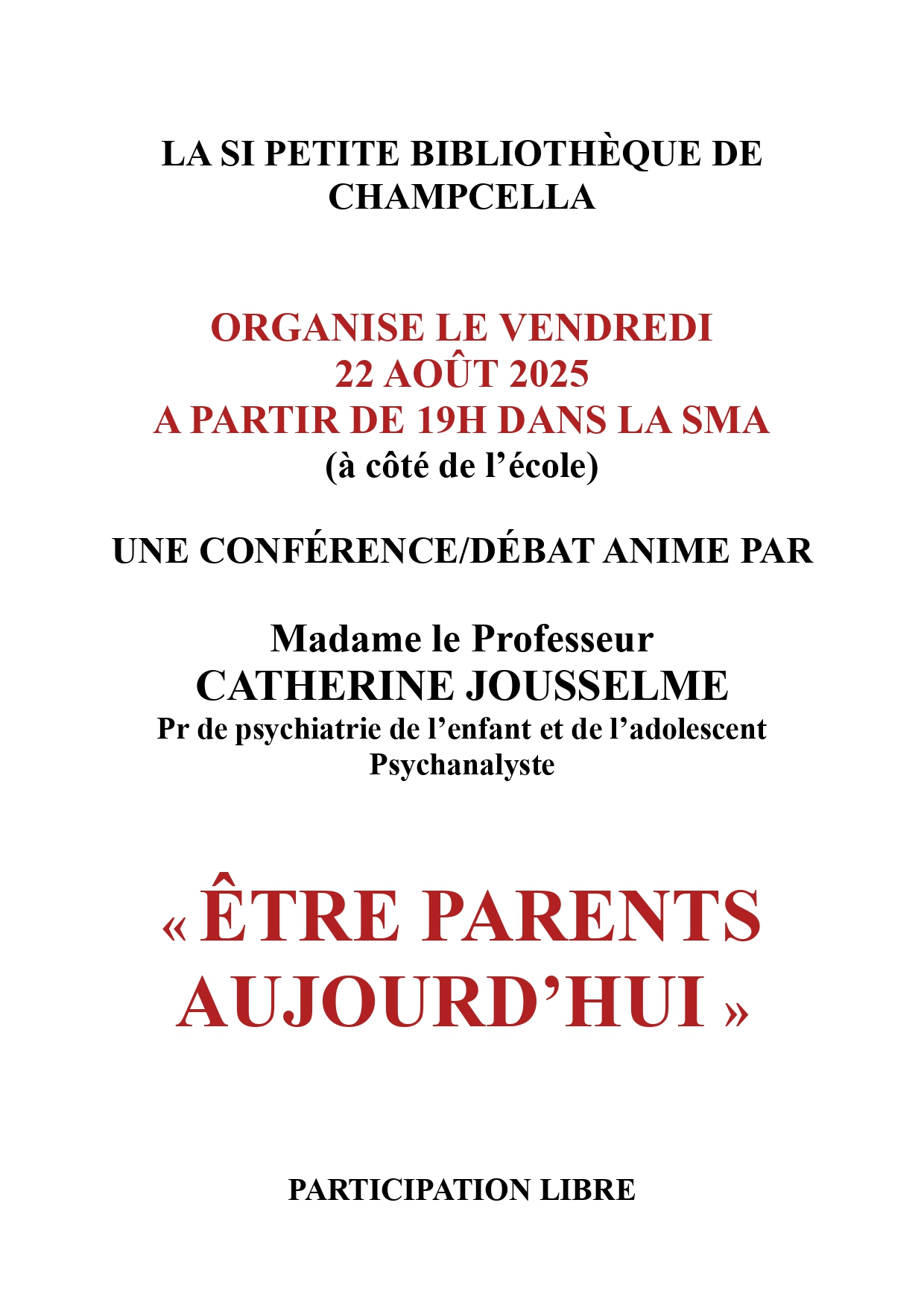 LA SI PETITE BIBLIOTHÈQUE DE CHAMPCELLA VENDREDI 22 AOÛT 2025 A PARTIR DE 19H DANS LA SMA (à côté de l’école) PARTICIPATION LIBRE