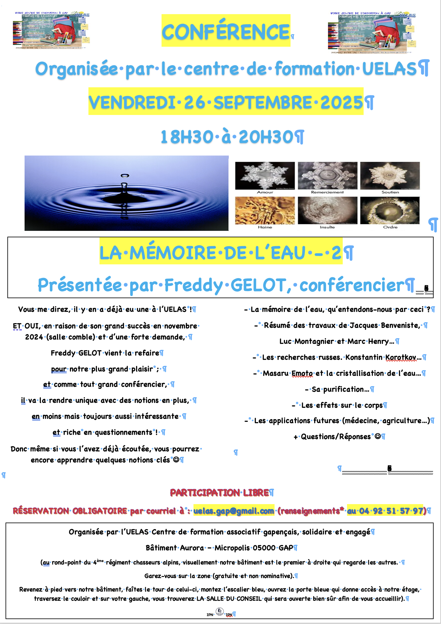 Vous me direz, il y en a déjà eu une à l’UELAS ! ET OUI, en raison de son grand succès en novembre 2024 (salle comble) et d’une forte demande, Freddy GELOT vient la refaire pour notre plus grand plaisir ; et comme tout grand conférencier, il va la rendre unique avec des notions en plus, en moins mais toujours aussi intéressante et riche en questionnements ! Donc même si vous l’avez déjà écoutée, vous pourrez encore apprendre quelques notions clés  – La mémoire de l’eau, qu’entendons-nous par ceci ? – Résumé des travaux de Jacques Benveniste, Luc Montagnier et Marc Henry… – Les recherches russes. Konstantin Korotkov… – Masaru Emoto et la cristallisation de l’eau… – Sa purification… – Les effets sur le corps – Les applications futures (médecine, agriculture…) + Questions/Réponses 
