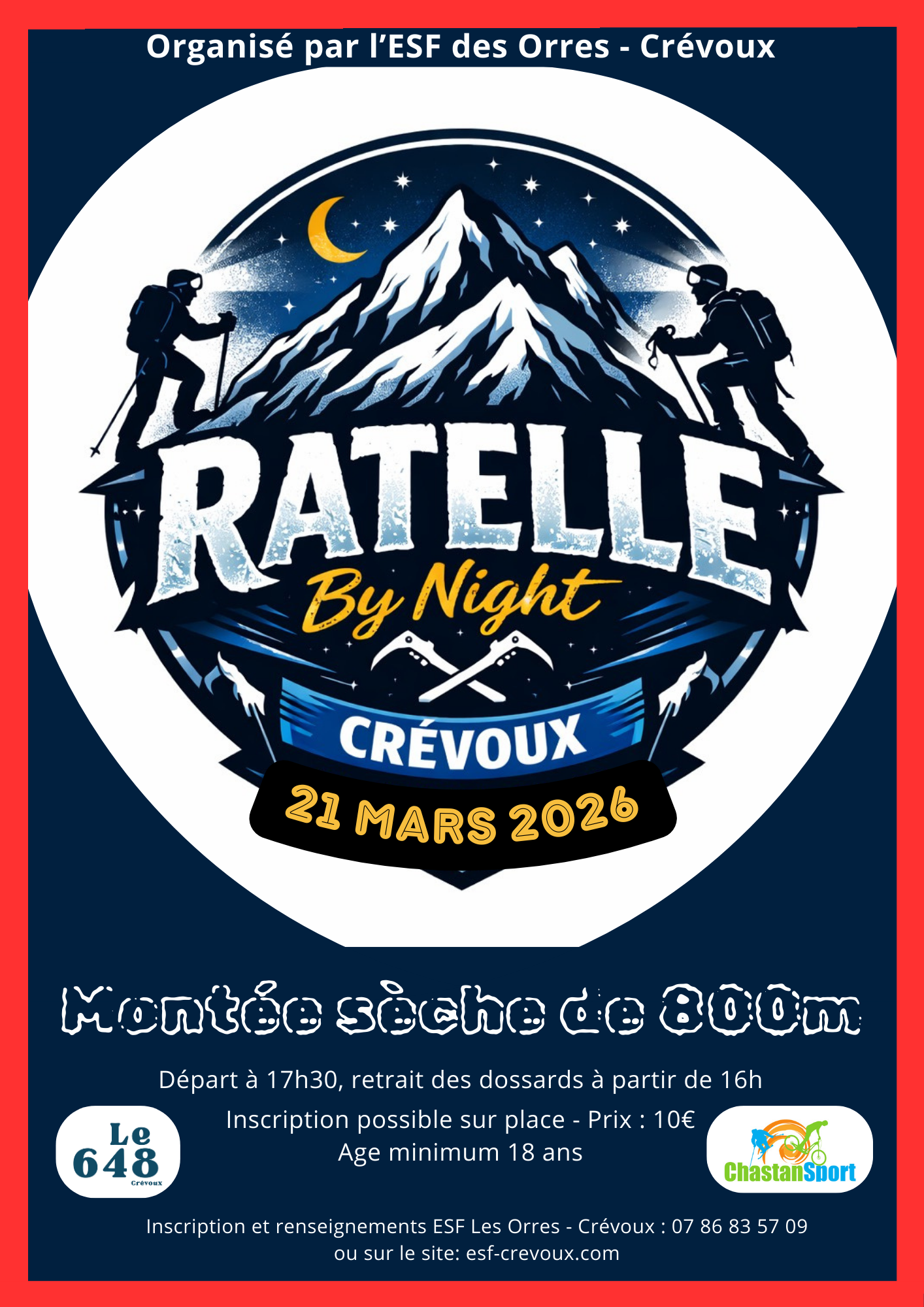 Course de ski de rando, montée sèche de 800m, seule la montée est chronométrée. Départ 17h30, retrait des dossards à partir de 16h.