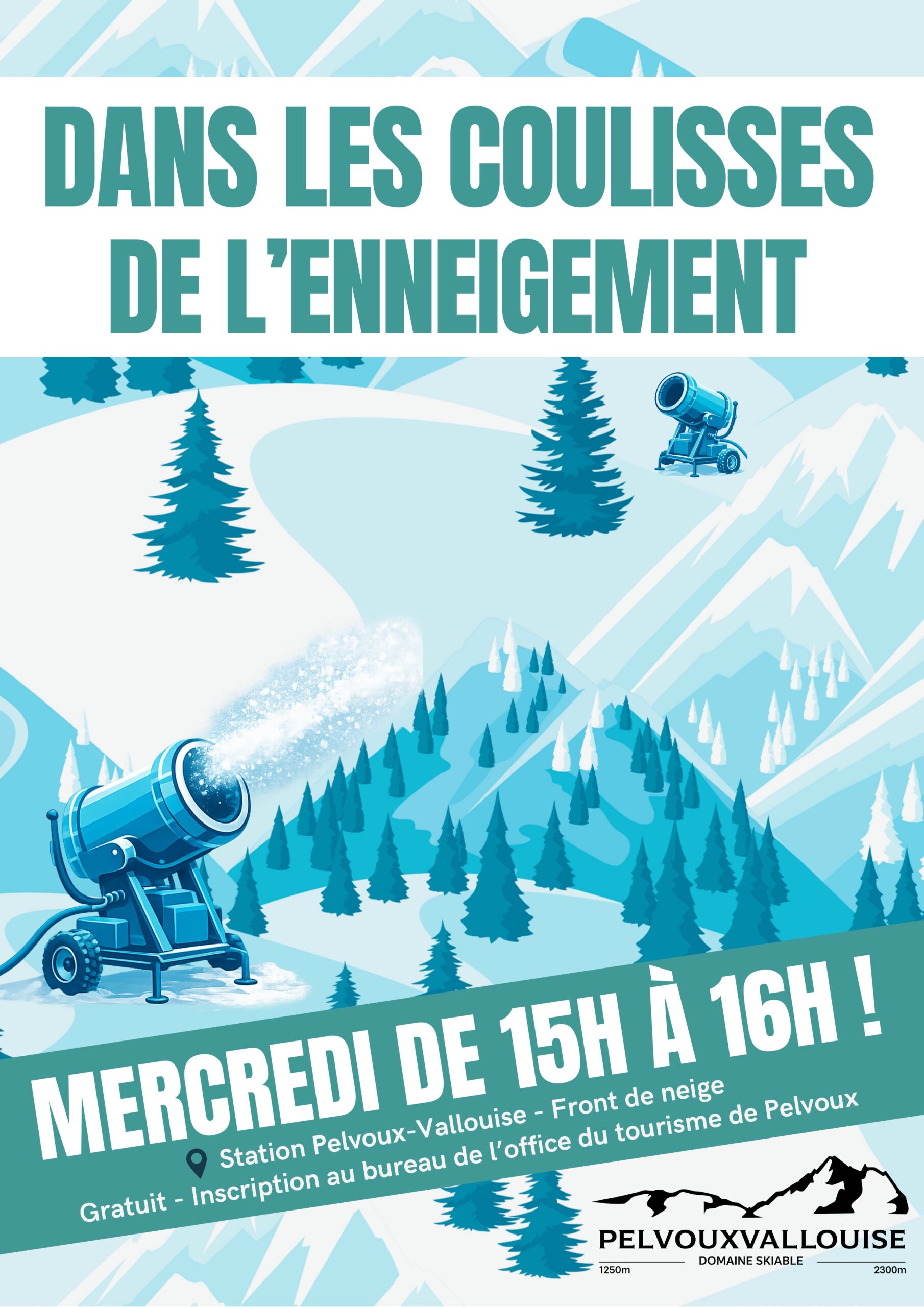 Dans les coulisses de l’enneigement Comment la station garantit-elle des pistes de qualité tout au long de la saison ? Venez le découvrir lors de cette animation gratuite et immersive au cœur de l’enneigement de la station. Accompagnés par Stéphane, professionnel du domaine skiable, les participants découvrent comment est organisé le domaine : le rôle des enneigeurs, le réseau d’eau, la gestion de la neige et les outils de supervision utilisés au quotidien. La visite se poursuit par la présentation de la salle des machines de pompage, véritable cœur du système, avant de découvrir de près un canon à neige, avec démonstration de mise en route lorsque les conditions le permettent. Une animation pédagogique et accessible à tous, idéale pour comprendre les coulisses du ski et le travail réalisé chaque jour pour offrir des conditions de glisse optimales, dans le respect du milieu montagnard. Inscription obligatoire aux bureaux d’information touristique Rdv hall de la station