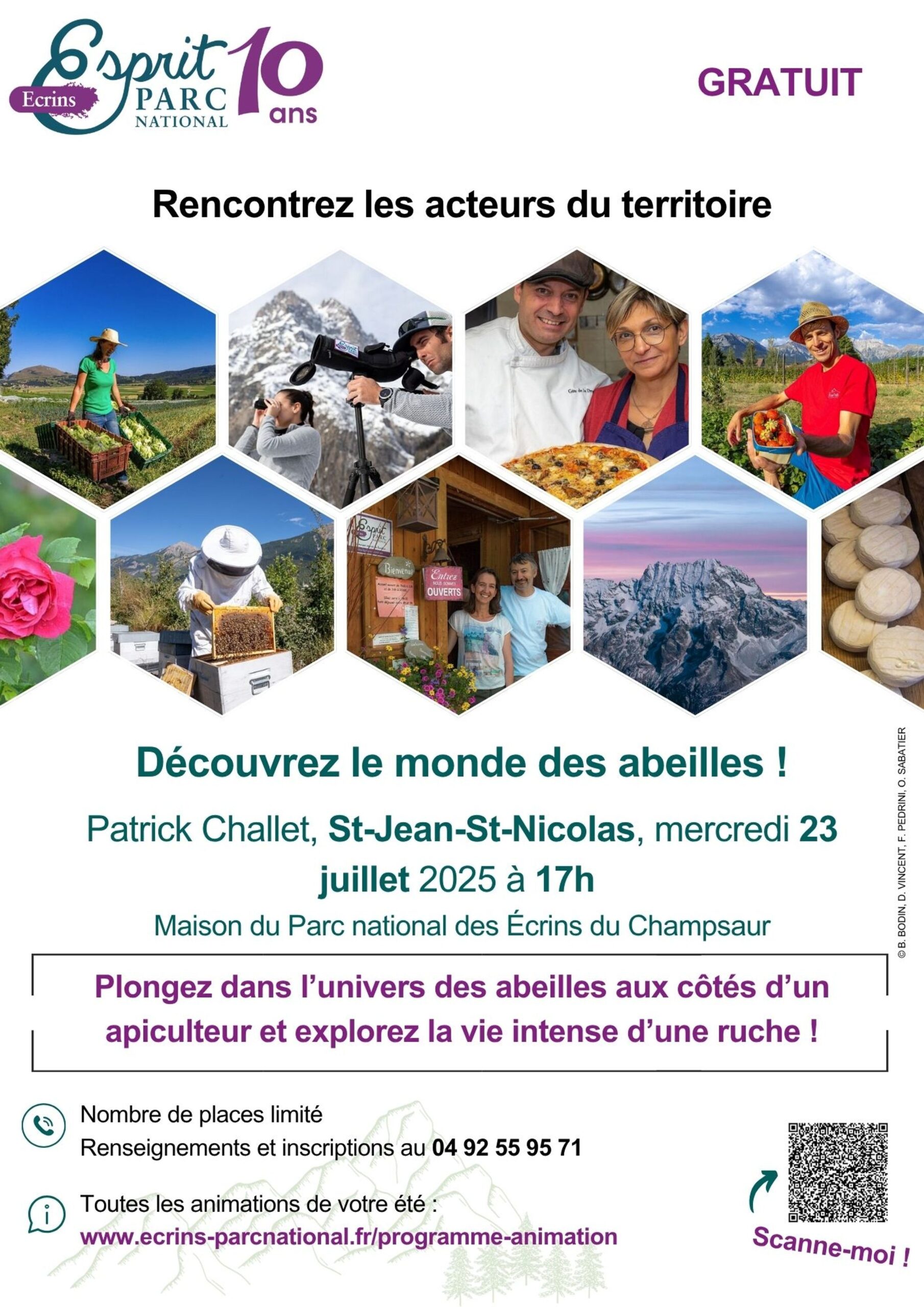 Découvrez la marque Esprit parc national : https://www.ecrins-parcnational.fr/la-marque-esprit-parc-nationalCette animation gratuite s’inscrit dans le cadre des 10 ans de la marque. Intervenant : Patrick Challet, apiculteur bénéficiaire de la marque “Esprit parc national”. Public : tout public, à partir de 8 ans.