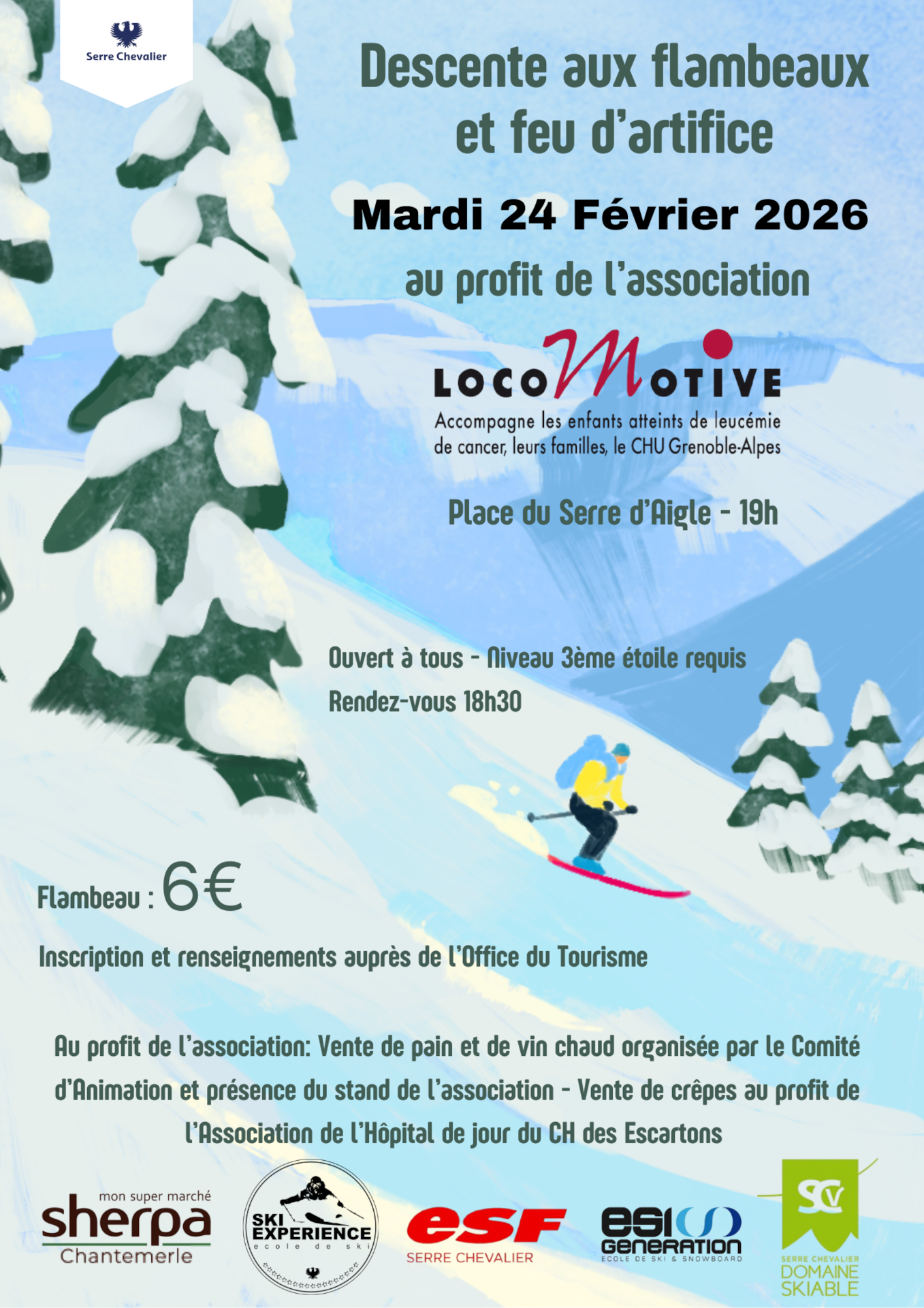 Descente aux flambeaux ouverte à tous pour soutenir l’association Locomotive, encadrée par les moniteurs des écoles de Ski (Ecole du Ski Français, Ski Experience, Generation Snow et le personnel SCV). Niveau 3* acquis minimum. Locomotive est une association grenobloise à but non lucratif qui accompagne les enfants atteints de cancer ou de leucémie, ainsi que leurs familles, en lien étroit avec le service d’Immunologie-Hématologie-Oncologie (IHO) pédiatrique du CHU Grenoble Alpes. Depuis plus de 30 ans, l’association s’engage activement pour améliorer le quotidien des enfants malades, tant à l’hôpital qu’en dehors, en apportant un soutien humain, matériel, moral et financier. A partir de 14h, l’association de l’hôpital Briançon de jour qui s’occupe des chimiothérapies proposera une vente de pains, crêpes et vin chaud.