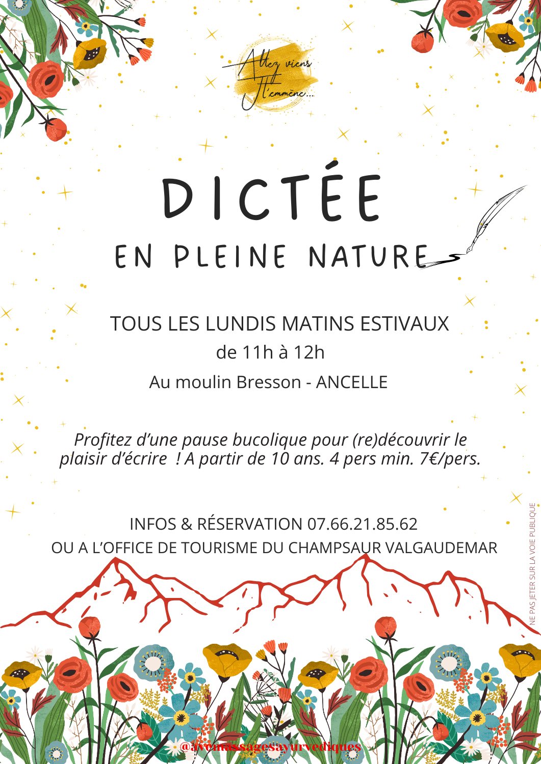 Cet atelier est là pour vous détendre et vous permettre de vous amuser en découvrant vos fautes en famille et/ou entre amis dans un cadre naturel magnifique. L’importance du résultat importe peu, la bonne humeur et les textes sont prépondérants. Prévoir chapeau et de l’eau.