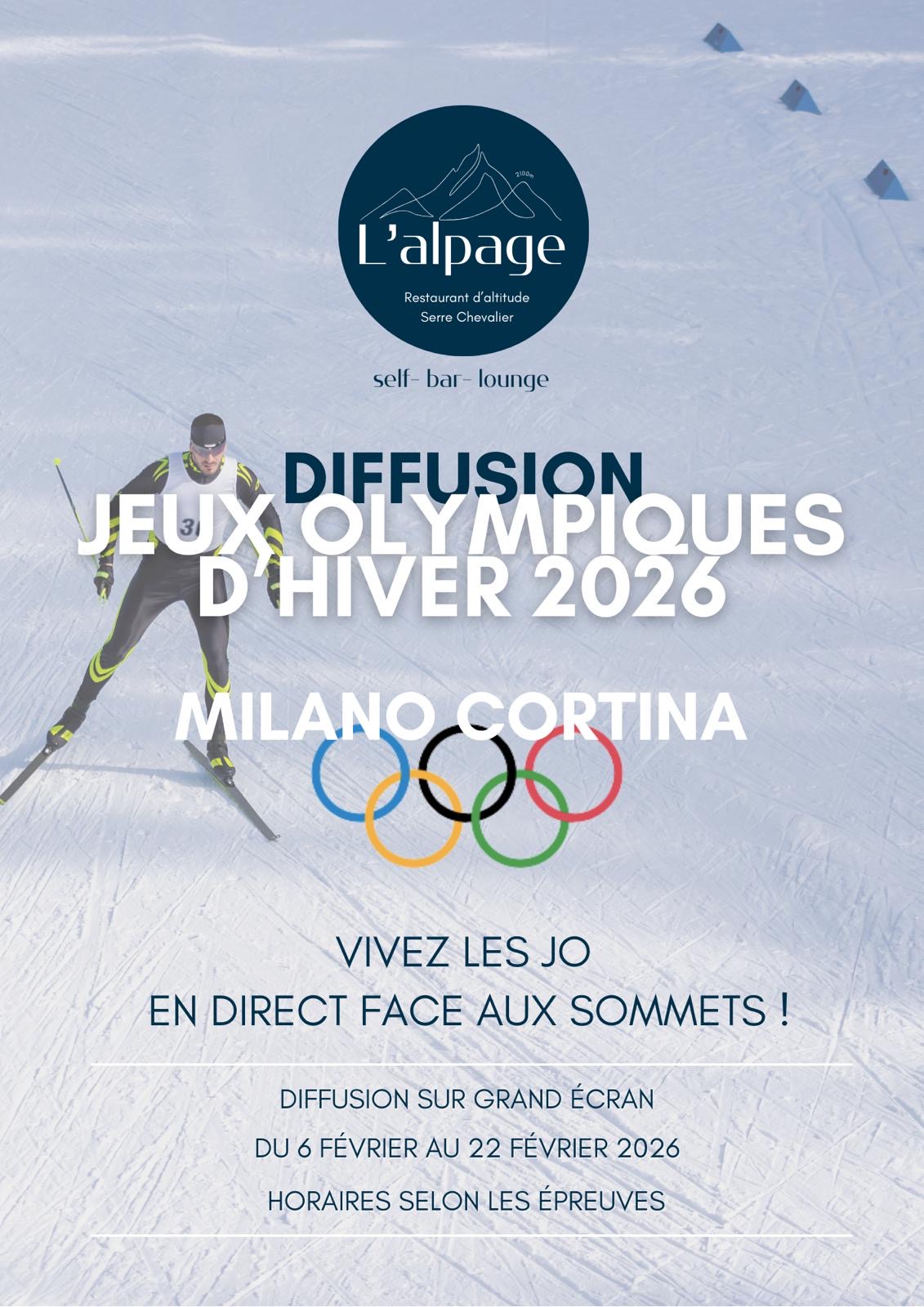 Suivez les JO 2026 sur grand écran, avec les sommets en arrière plan.