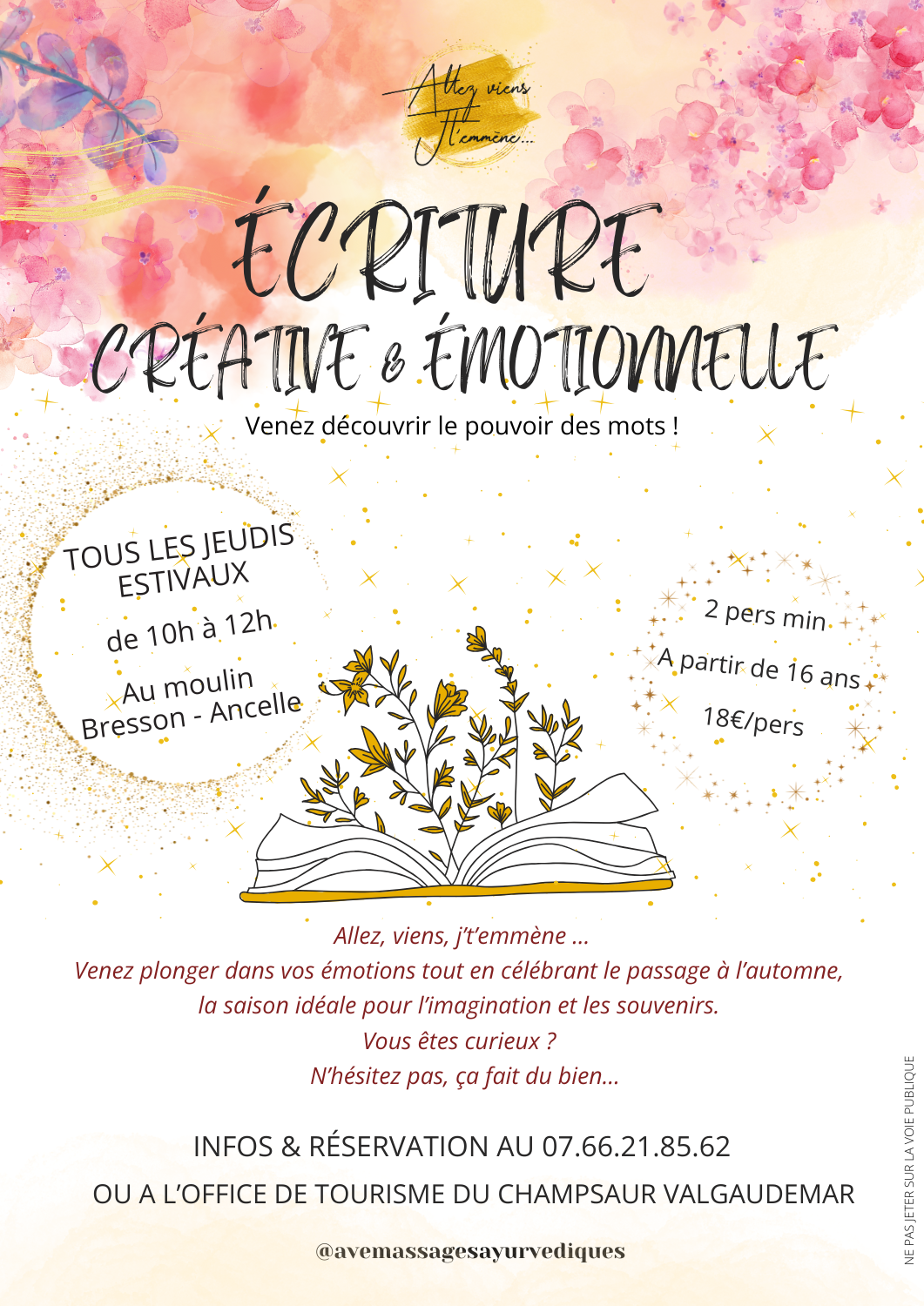 Lors de cet atelier, nous allons faire appel aux mots pour faire ressortir votre créativité et faire briller vos émotions. Toujours dans une démarche de plaisir et de découverte, ce temps est pour vous. Prévoir chapeau et de l’eau. A partir de 16 ans. Dès 2 personnes minimum.