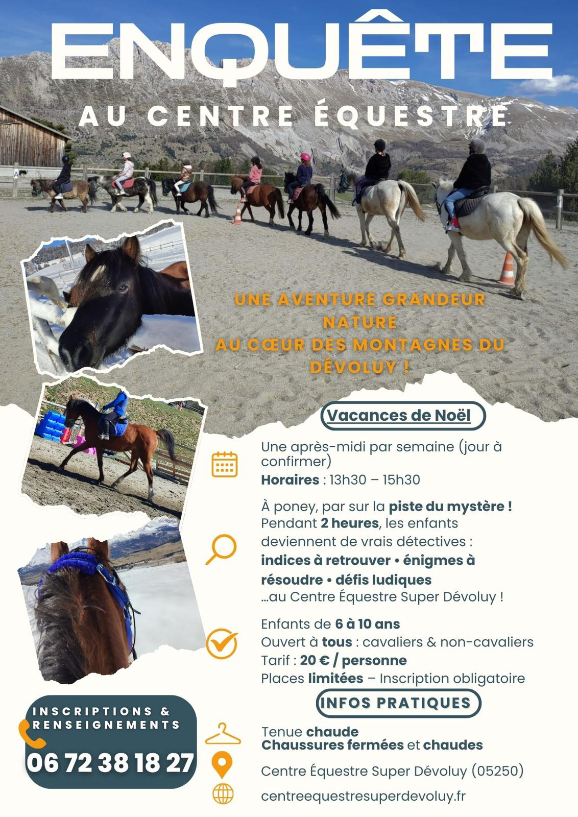 Pendant 2 heures, les enfants partent à l’aventure au Centre Équestre Superdévoluy et se transforment en véritables détectives ! À poney, ils suivent une piste mystérieuse ponctuée d’indices à retrouver, d’énigmes à résoudre et de défis ludiques, dans une ambiance amusante et immersive. Cette activité est accessible à tous les enfants, cavaliers comme non-cavaliers, et encadrée par des professionnels pour garantir sécurité et plaisir. Places limitées – inscription obligatoire Infos pratiques : – Prévoir une tenue chaude – Chaussures fermées et chaudes obligatoires