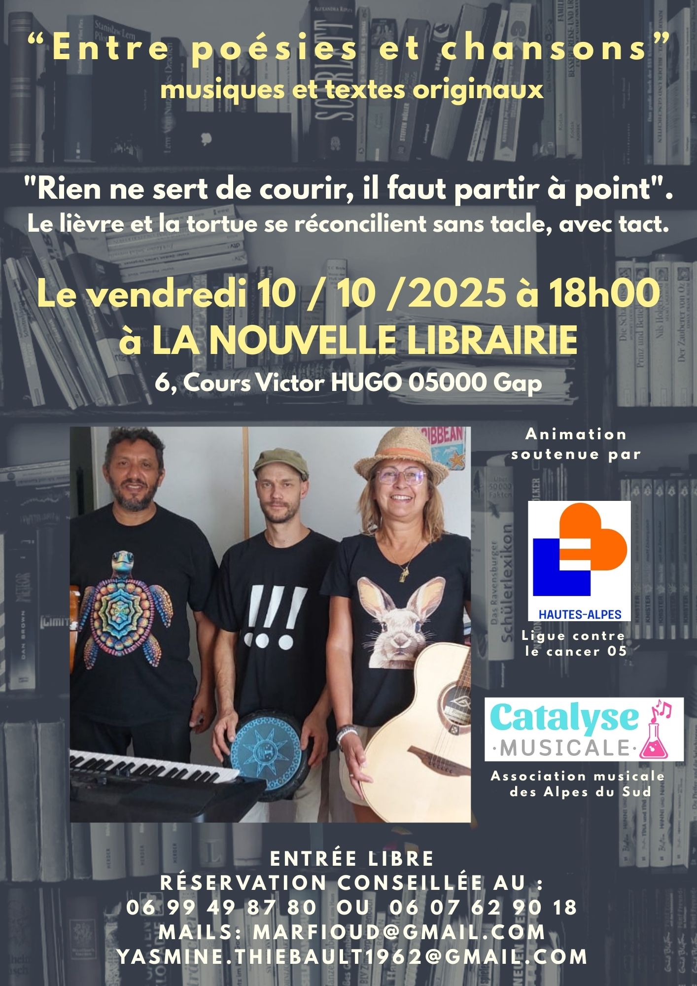 “Effusion de musiques et de textes originaux, à la saveur poétique, pour un instant de partage mêlé de rythmes, de voix, d’émotions. ” Yasmine, à la plume fine et bondissante sous son pelage. « Il se déclare à la plume. On se l’avoue dans la brume. Quand on s’ancre sur les dunes, Il s’inscrit à l’encre brune. » Marf, à la prose imaginative et aiguisée sous sa carapace. « Quelques phrases sur le papier, un tissu de soie sur ses plaies. » Andy, leur point d’exclamation, pianiste proche de dame nature, accompagnera ces deux voix. Avec le soutien du Comité de la Ligue Contre le Cancer des Hautes-Alpes (05), de l’Association Catalyse des Alpes de Haute Provence, de la Nouvelle Librairie de Gap (05)