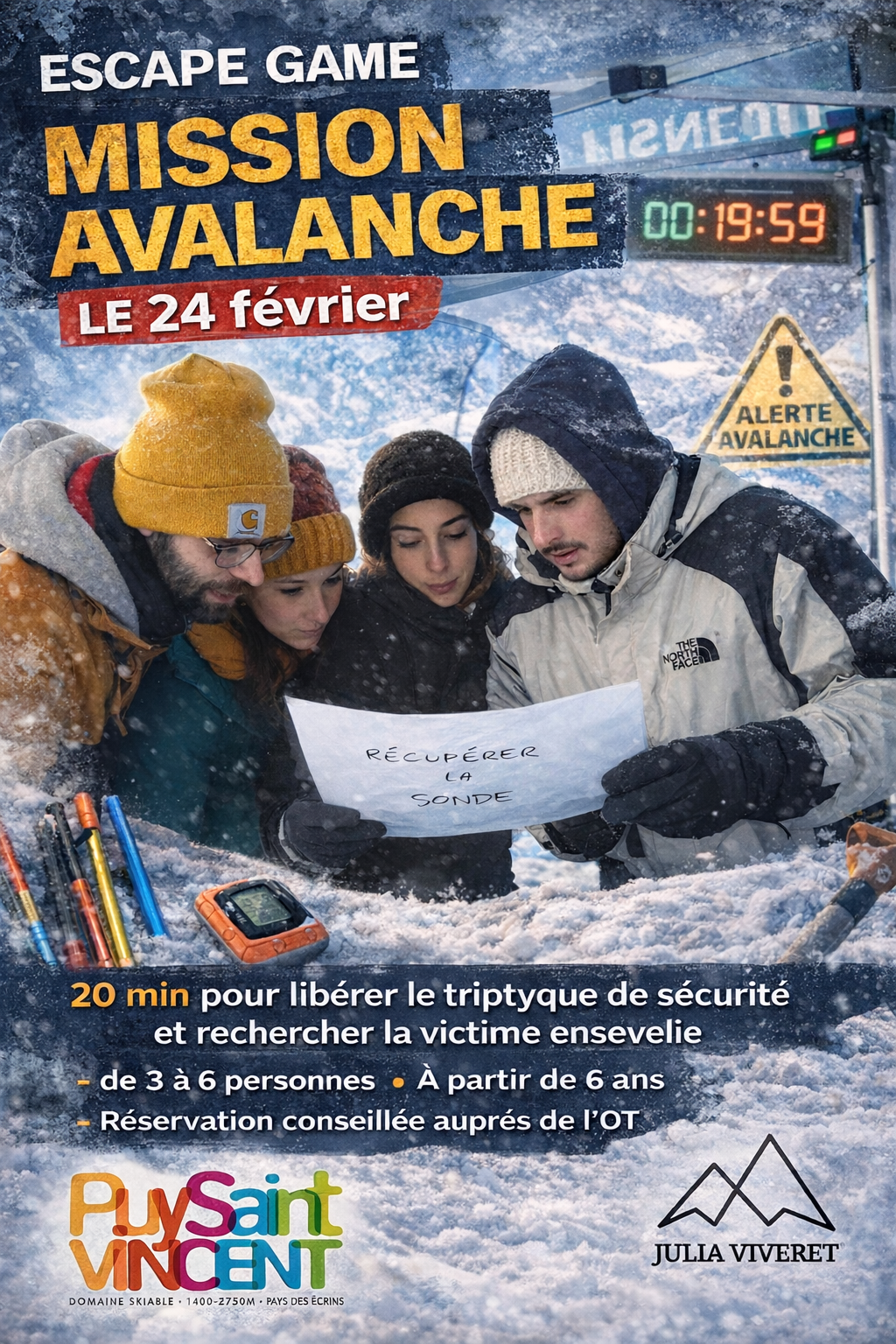 ESCAPE GAME MISSION AVALANCHE Alerte avalanche, une personne est enfouie sous la neige, votre mission si vous l’acceptez est de rassembler le triptyque de sécurité (DVA, pelle, sonde) puis aller rechercher cette victime. Vous avez 20 min pour résoudre les énigmes, libérer le matériel de recherche et sauver la victime. Un escape game ludique et éducatif à faire en famille ou entre amis. Avec Julia VIVERET A la suite de la mission, un temps de 15 min par groupe est prévu pour un débriefing et des échanges. Les infos en détails : > groupe de 3 à 6 personnes > créneaux de 45 min (20 min de jeu + temps complémentaire si besoin – 15 min de débriefing) > inscriptions auprès de l’Office de Tourisme sur les créneaux suivants: > 9h30 – 10h 45 – 11h30 – 12h15 – 13h00 – 13h45 – 14h30 – 15h15 – 16h00