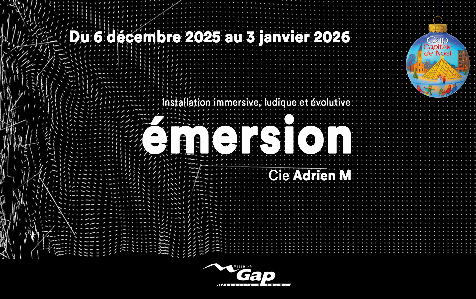 Cette installation est une véritable invitation à vivre une expérience sensorielle inédite. “émersion” vous plonge dans un univers poétique où lumière, sons et mouvements s’entremêlent. Sur le sol, une grande projection de particules blanches évolue en permanence : elles deviennent tour à tour atomes, organismes vivants ou astres, symbolisant le mouvement perpétuel de la vie. Grâce à un système de capteurs, chaque visiteur peut interagir avec l’œuvre. En se déplaçant, il modifie le paysage visuel et sonore, créant des effets uniques et parfois spectaculaires, comme de véritables «supernovae» qui illuminent l’espace. Émersion, c’est un mini-cosmos où chacun peut explorer, jouer et contempler, tout en vivant un moment hors du temps. Une expérience magique, contemplative et ludique, accessible à tous. La Cie Adrien M est artiste associé au Théâtre «La Passerelle» pour cette saison 2025/2026.