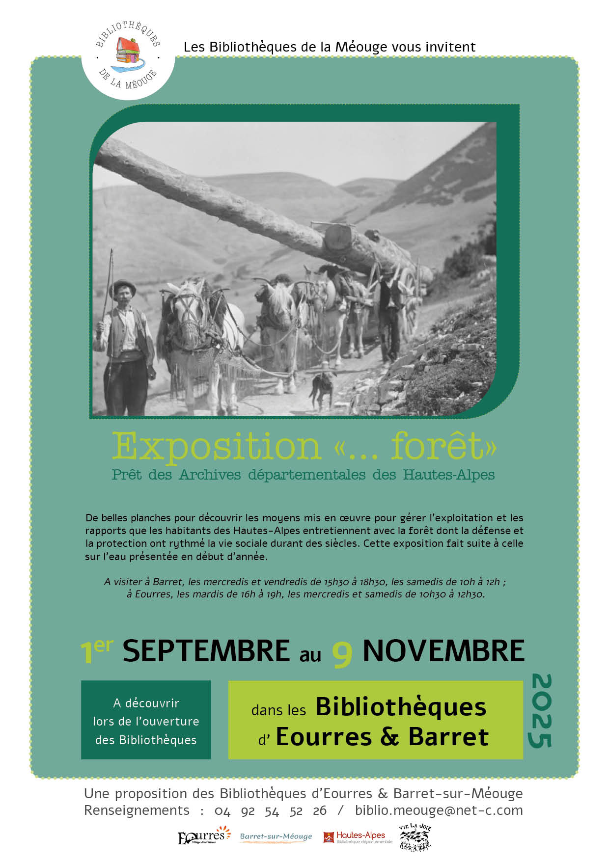 Prêt des Archives départementales des Hautes-Alpes qui fait suite à l’exposition sur l’eau présentée en début d’année. A découvrir du 1er septembre au 9 novembre, lors de l’ouverture des Bibliothèques d’Eourres & Barret : à Barret, les mercredis et vendredis de 15h30 à 18h30, les samedis de 10h à 12h ; à Eourres, les mardis de 16h à 19h, les mercredis et samedis de 10h30 à 12h30. Une proposition des Bibliothèques d’Eourres & Barret-sur-Méouge Renseignements : 04 92 54 52 26 / biblio.meouge@net-c.com