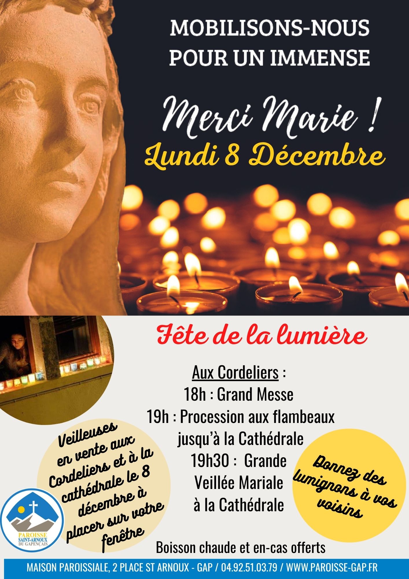 La paroisse de Gap organise cette fête : 18h Messe à l’église des Cordeliers, 19h Procession aux flambeaux des Cordeliers jusqu’à la Cathédrale; 19h30 Veillée à la Cathédrale jusqu’à 21h30. Lumignons en vente le 8 décembre aux Cordeliers et à la Cathédrale pour illuminer ses fenêtres.