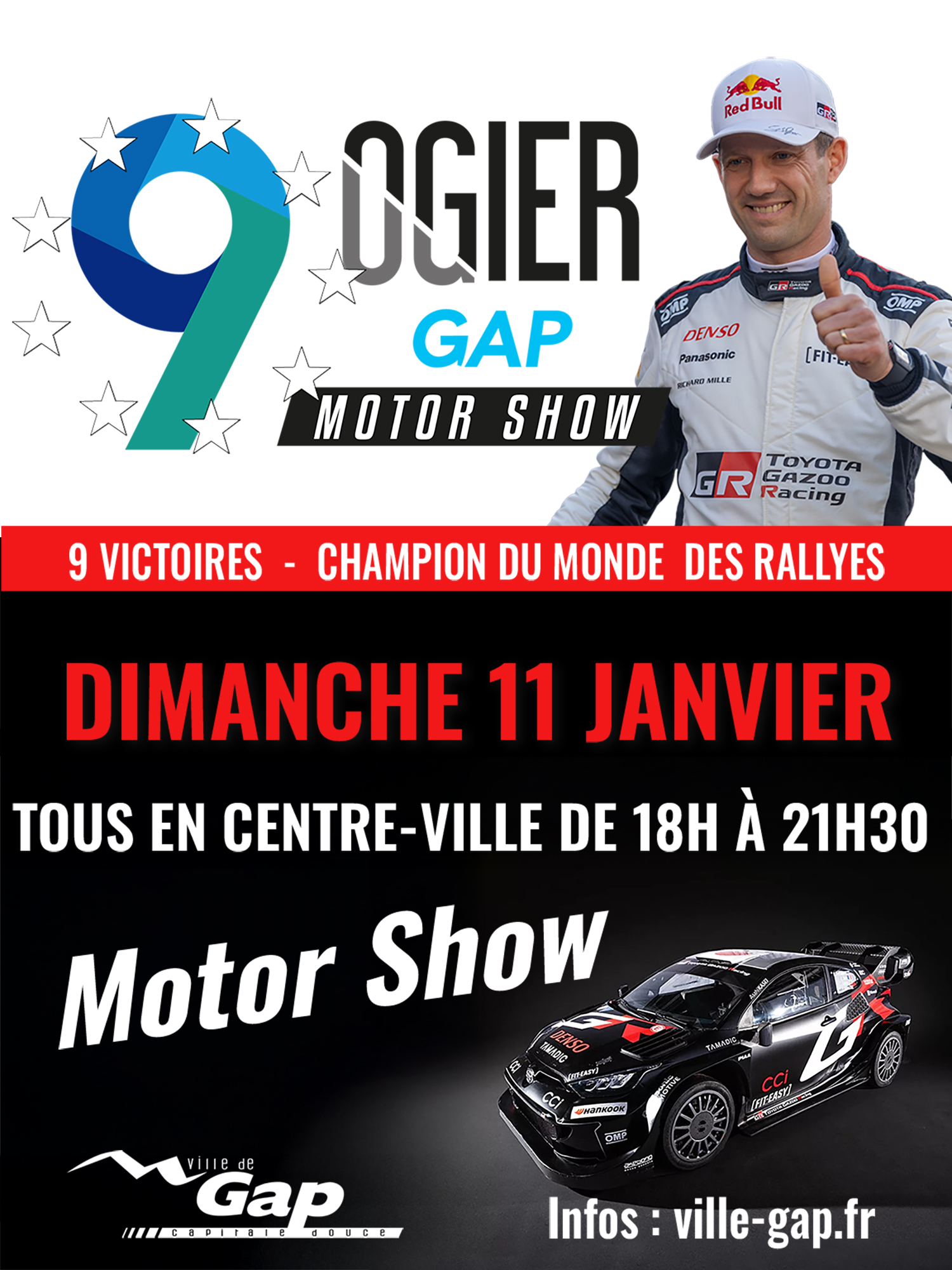 Sébastien OGIER – 9 victoires – champion du monde des Rallyes 18h : arrivée de S. OGIER en bas de la rue Carnot 18h15 – remontée de S. OGIER jusqu’à la rue Elysée 18h30 : séances de dédicaces place Jean Marcellin 19h : Gap Motor show sur le cours Ladoucette, parades de véhicules de rallyes mythiques, passage de Sébastien OGIER au volant de la Toyota GR Yaris Rally1 20h30 : projection d’un film de Jacques MALLEN sur la saison 2025 de Sébastien OGIER sur écrans géants, place Ladoucette puis séance protocolaire sur scène suivie d’un moment de convivialité sur l’Esplanade Desmichels