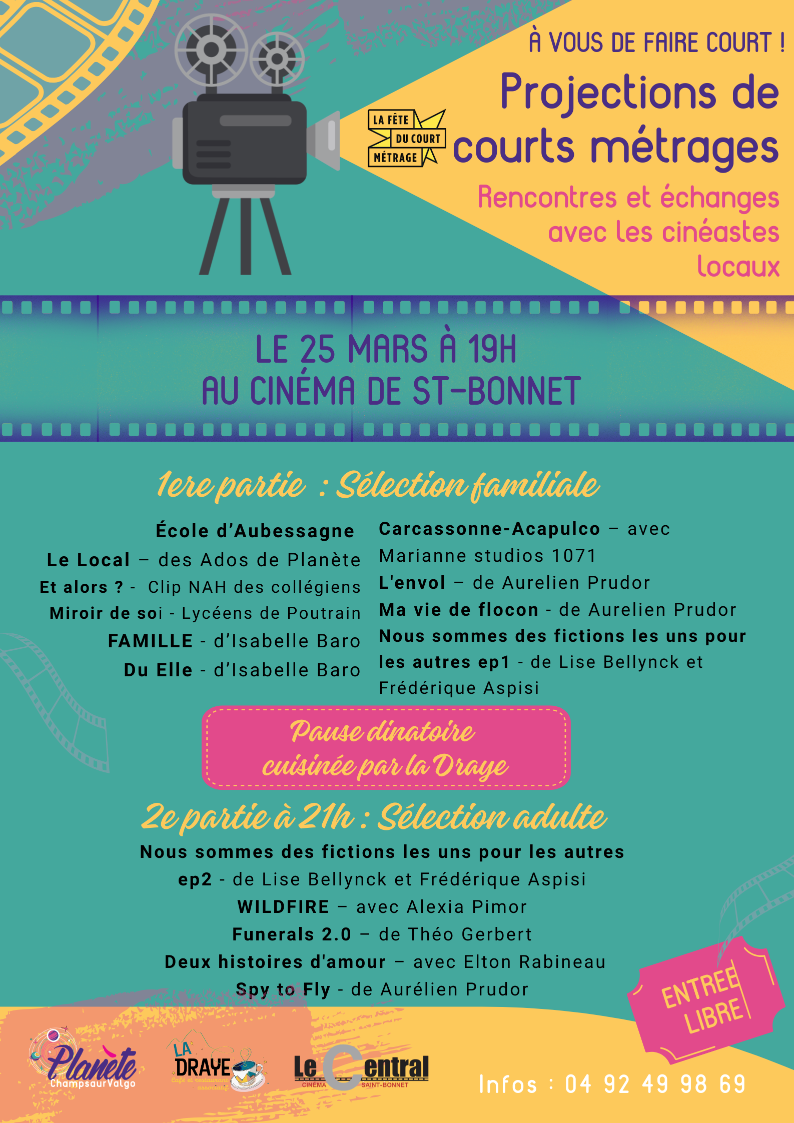 Cette soirée sera l’occasion de découvrir une programmation variée mêlant animation, documentaire, science, poésie, humour et fiction, mais aussi de rencontrer celles et ceux qui font les films, réalisateurs et professionnels du cinéma seront présents pour échanger avec le public après les projections. Chaque projection sera suivie d’un temps d’échange avec les invités, l’occasion de découvrir les coulisses de la création, les choix artistiques et les histoires derrière les films leur démarche artistique et répondre à vos questions. Parmi les invités présents : Alexia Pimor, viendra nous présenter WILDFIRE où elle à contribué à la production lors de ses études aux Gobelins, un court métrage d’animation intense et sensible qui suit Ena, une femme pompier passionnée par le feu, dont l’engagement professionnel influence profondément sa vie personnelle et familiale. Aurélien Prudor nous fera voyager à travers trois films : • Ma vie de flocon – un documentaire scientifique fascinant qui nous plonge dans l’infiniment petit de la neige, des Alpes françaises jusqu’à l’Arctique canadien, aux côtés d’une équipe de recherche de Météo-France. • L’Envolé – un court métrage poétique qui accompagne un jeune albatros à l’approche de son premier départ vers le large, un moment déterminant dans la vie de cet oiseau marin. • Spy to Fly – ce film parle d’une démarche de scientifique centrée sur l’étude des vautours et des parapentistes. Espionner pour mieux voler Marianne Chazelas, productrice des Studios 1071, présentera l’animation Carcassonne – Acapulco réalisée par Marjorie CAUP et Olivier Héraud. Une comédie absurde et jubilatoire où l’équipage d’un avion voit son voyage bouleversé lorsqu’un inconnu frappe… à la porte extérieure de l’appareil. Théo Gerbert, nous présentera Funerals 2.0 de , une œuvre visuelle et symbolique qui imagine les funérailles d’une forêt mourante, entre rituel, créatures mystérieuses et renaissance numérique de la nature. Elton Rabineau, ingénieur du son, accompagnera la projection du film Deux histoires d’amour réalisé par Joseph Minster, un thriller poignant dans lequel un accident de chasse conduit à une confrontation judiciaire bouleversante. Isabelle Baro sera également présente avec deux créations : • DU elle, une courte comédie autour d’un duel inattendu entre deux femmes • Famille, une animation qui aborde avec simplicité la pluralité des formes de familles. Lise Bellynck et Frédéric Aspisi présenteront deux épisodes de leur série documentaire Nous sommes des fictions les uns pour les autres, tournée en Afrique de l’Ouest. Une œuvre sensible et poétique qui explore le quotidien sans misérabilisme, à hauteur d’être humain. La soirée mettra aussi en lumière les jeunes talents du territoire avec plusieurs films réalisés par des élèves et des jeunes : • Le Local, film en stop motion réalisé par les adolescents de Planète Champsaur Valgaudemar • Et alors ?, un clip engagé contre le harcèlement créé par les élèves du collège de Saint-Bonnet-en-Champsaur • un court film d’animation réalisé par l’école de Chauffayer Venez partager un moment de cinéma, de découverte et de dialogue avec les créateurs.