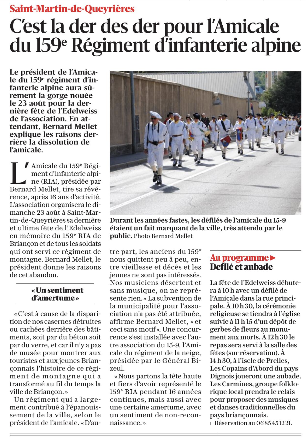 Saint-Martin-de-Queyrières C’est la der des der pour l’Amicale du159e Régiment d’infanterie alpine Le président de l’Amicale du 159e régiment d’infanterie,alpine aura sûrement la gorge nouée le 23 août pour la dernière fête de l’Edelweiss de l’association. En attendant, Bernard Mellet explique les raisons derrière la dissolution de l’amicale. L’ Amicale du 159c Régiment d’infanterie alpine (RIA), présidée par Bernard Mellet, tire sa révérence, après 16 ans d’activité. L’association organisera le dimanche 23 août à Saint-Martin- de-Queyrières sa dernière et ultime fête de !’Edelweiss en mémoire du 159e RIA de Briançon et de tous les soldats qui ont servi ce régiment de montagne. Bernard Mellet, le président donne les raisons de cet abandon. « Un sentiment d’amertume» «C’est à cause de la disparition de nos casernes détruites ou cachées derrière des bâtiments, soit par du béton soit par du verre, et car il n’y a pas de musée pour montrer aux touristes et aux jeunes Briançonnais l’histoire de ce régiment de montag n e qui a transformé au fil du temps la ville de Briançon.» Un régiment qui a largement contribué à l’épanouissement de la ville, selon le président de l’amicale. « D’autre part, les anciens du 159° nous quittent peu à peu, entre vieillesse et décès et les jeunes ne sont pas intéressés. Nos musiciens désertent et ans musique, on ne représente rien.» La subvention de la municipalité pour l’association n’a pas été attribuée, affirme Bernard Mellet, « et ceci sans motif». Une concurrence s’est installée avec l’autre association du 15-9, l’Amicale du régiment de la neige, présidée par le Général Bizeul. «Nous partons la tête haute et fiers d’avoir représenté le 159° RIA pendant 16 années continues, mais aussi avec une certaine amertume, avec un sentiment de non-reconnaissance.» Au programme ► Defilé et aubade La fête de l’Edelweiss débutera à 10 h avec un défilé de l’Amicale dans la rue principale. À 10 h 30, la cérémonie religieuse se tiendra à l’église suivie à il h 15 d’un dépôt de gerbes de fleurs au monument aux morts. À 12 h 30 le repas sera servi à la salle des fêtes (sur réservation). À 14h30, à l’iscle de Prelles, Les Copains d’Abord du pays Dignois joueront une aubade. Les Carmines, groupe folklorique local prendra le relais pour proposer des musiques et danses traditionnelles du pays briançonnais. Réservation au 06 85 4512 21. nous quittent peu à peu, en tre vieillesse et décès et les jeunes ne sont pas intéressés. Nos musiciens désertent et sans musique, on ne repré sente rien.» La subvention de la municipalité pour l’asso ciation n’a pas été attribuée, affirme Bernard Mellet, « et ceci sans motif». Une concur rence s’est installée avec l’au tre association du 15-9, l’Ami cale du régiment de la neige, présidée par le Général Bi zeul. « Nous partons la tête haute et fiers d’avoir représenté le 159° RIA pendant 16 années continues, mais aussi avec une certaine amertumeJ avec un sentiment de non-recon naissance.» Au programme► DefUé et aubade La fête de l’Edelweiss débute ra à10h avec un défilé de l’Amicale dans la rue princi pale. À10h30, la cérémonie religieuse se tiendra à l’église suivie à ll h 15 d’un dépôt de gerbes de fleurs au monu ment aux morts. À12 h30 le repas sera servi à lasalle des fêtes (sm·réservation). À 14h30, àl’iscle de Prelles, Les Copains d’Abord du pays Dignoisjoueront une aubade. Les Carmines, groupe folklo rique local prendra le relais pour proposer des musiques et danses traditionnelles du pays briançonnais. 1 Réservation au 0685451221. Tous renseignements au : 06 85 45 12 214