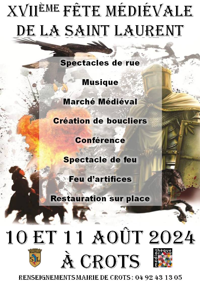 Tout au long des 2 journées : Cie Claymor Clan : Spectacle musical en tenue Ecossaise Cie MandalaS : Spectacles vivants « Rire en voie d’extinction », « Comme à la maison », « Jongleurs minute », « Ca va passer » Cie Les Banneret du Midi : Campement médiéval (Vie de camp, combats, vesture du chevalier, Pilori, calligraphie, jeux en bois géant… Cie Drakonia : Combats de Chevaliers Cie Imaziren : Spectacle de feu Un programme détaillé : Samedi 10 août 10h00 Fabrique ton bouclier (sur réservation obligatoire au 04 92 43 77 43) – CCSP 13h00 Fabrique ton bouclier (sur réservation obligatoire au 04 92 43 77 43) – CCSP 14h00 Ouverture du marché médiéval 14h00 Ouverture du Campement – Bannerets du Midi 14h00 Musique celtique – Claymor Clan 15h00 Combat de chevaliers – Cie Drakonia 16h00 Fabrique ton bouclier (sur réservation obligatoire au 04 92 43 77 43) – CCSP 16h00 Musique celtique – Claymor Clan 17h00 Combat de chevaliers – Cie Drakonia 18h00 Conférence : Le Moyen-âge et l’Embrunais – Claude Martinaud – Médiathèque 19h00 Jonglerie et théâtre – Cie MandalasS 20h00 Combat de chevaliers – Cie Drakonia 21h00 Musique celtique – Claymor Clan 22h00 Spectacle de feu – Cie Imaziren Dimanche 11 août: 10h00 Ouverture du Marché 10h30 Ouverture du Campement – Bannerets du Midi 11h00 Musique celtique – Claymor Clan 12h00 Combat de chevaliers – Cie Drakonia 15h00 Jonglerie et théâtre – Cie MandalaS 16h00 Musique celtique – Claymor Clan 17h00 Musique et derviche tourneur – Cie Imaziren & Ibrahim Hassan 18h00 Combat de chevaliers – Cie Drakonia 19h00 Jonglerie et théâtre – Cie MandalaS 21h00 Musique celtique – Claymor Clan 22h00 Spectacle de feu – Cie Imaziren 23h30 Feu d’artifice Marché médiéval samedi de 14h00 à minuit et dimanche de 10h00 à minuit Buvette et restauration sur place